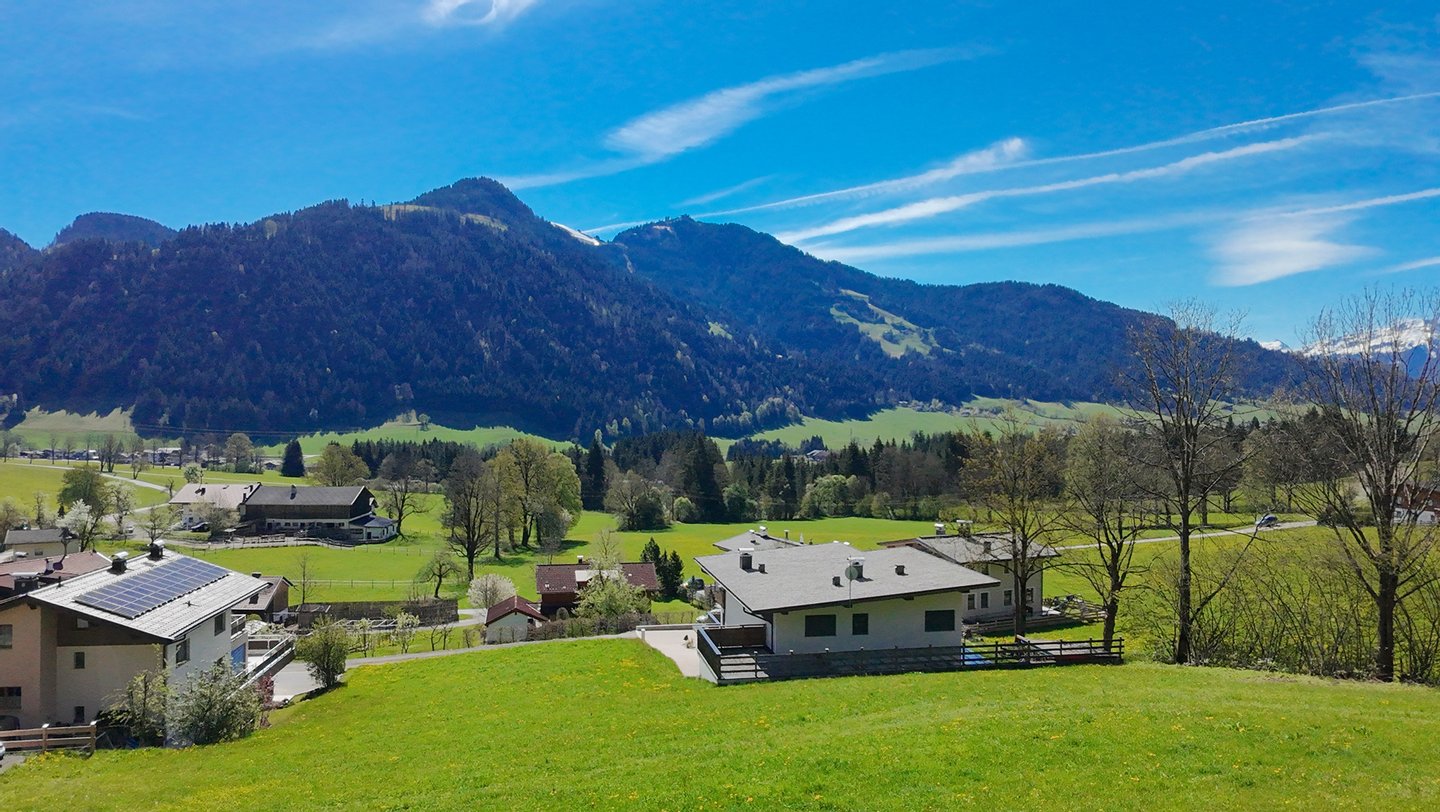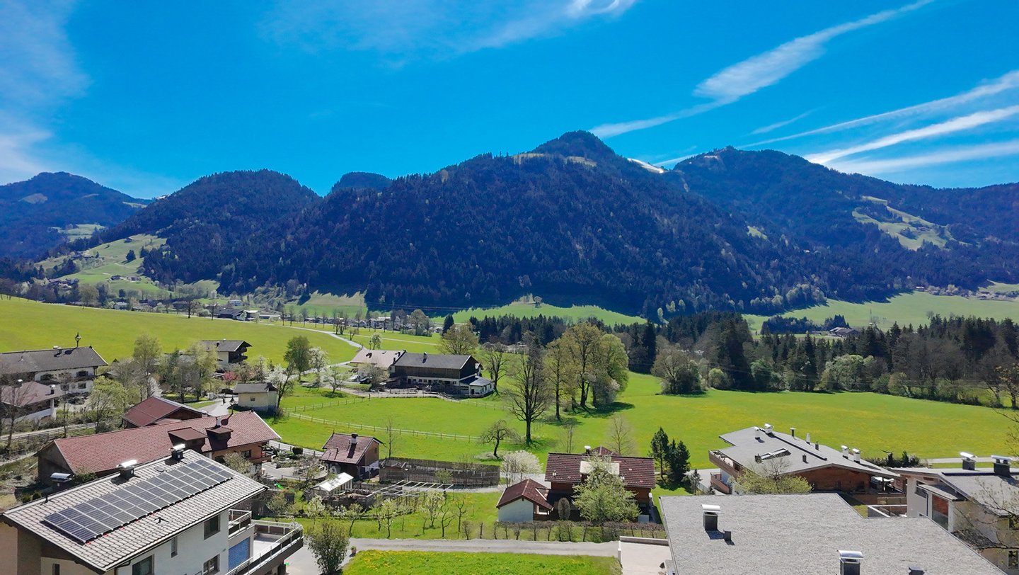Der Ausblick auf die beeindruckende Bergwelt mit Wilder Kaiser, Brandstadl und Saukogl ist atemberaubend.