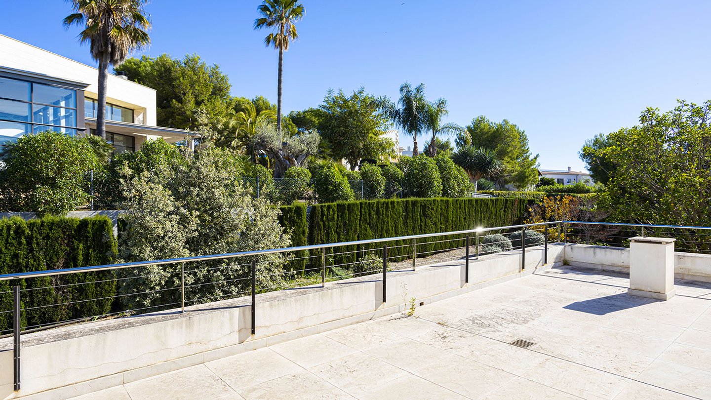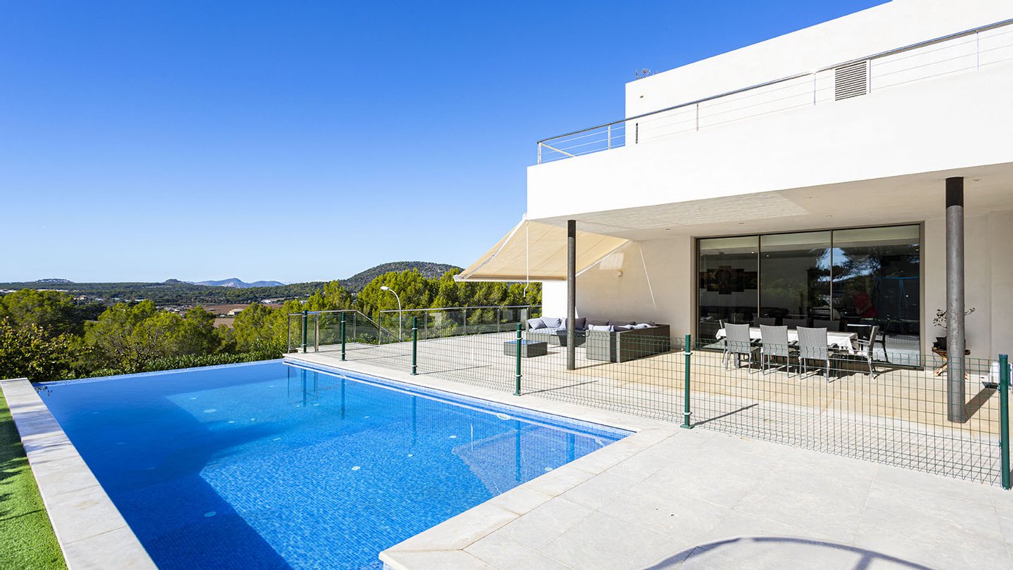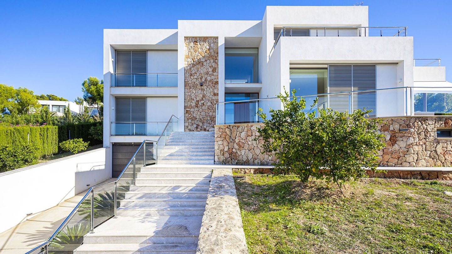 Stilvolle Villa mit Pool auf einem großzügigen Grundstück in einer ruhigen Wohngegend im Südwesten von Mallorca.Das perfekte Zuhause für die ganze Familie. Die moderne Villa befindet sich auf einem ca. 1.450 m2 großen Grundstück und verfügt über eine bebaute Fläche von ca. 440 m2. Auf 3 Etagen, die über eine Treppe miteinander verbunden sind, verteilen sich: 4 Schlafzimmer, 4 Badezimmer (3 davon en suite), Ankleide, ein Gäste-WC, ein Wohn-Esszimmer, ein weiteres Esszimmer, eine offene Einbauküche mit Elektrogeräten, ein Hauswirtschaftsraum, ein Abstellraum, sowie ein Keller. Der Einbau eines Aufzuges ist problemlos möglich. Insgesamt werden 3 Terrassen geboten, von denen man einen malerischen Weitblick auf die umliegende Natur und das majestätische Tramuntana-Gebirge genießen kann. Hier werden moderne Technik und mediterrane Designelemente harmonisch miteinander kombiniert. Für viel Wohnkomfort sorgen folgende hochwertige Ausstattungen: Fußbodenheizung, Klimaanlage, neueste Wärmepumpentechnologie, doppelt verglaste Aluminiumfenster, Solarenergie, Videoalarmanlage, Musikanlage, Einbauschränke, Parkettböden, 5 Tiefgaragenstellplätze, 2 weitere PKW-Stellplätze und vieles mehr. Der großzügige Außenbereich mit dem erfrischenden Pool und dem liebevoll angelegten Garten vervollständigen dieses einzigartige Angebot.