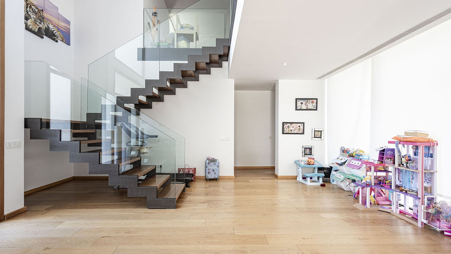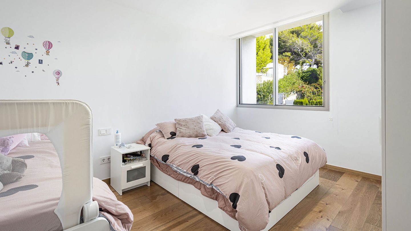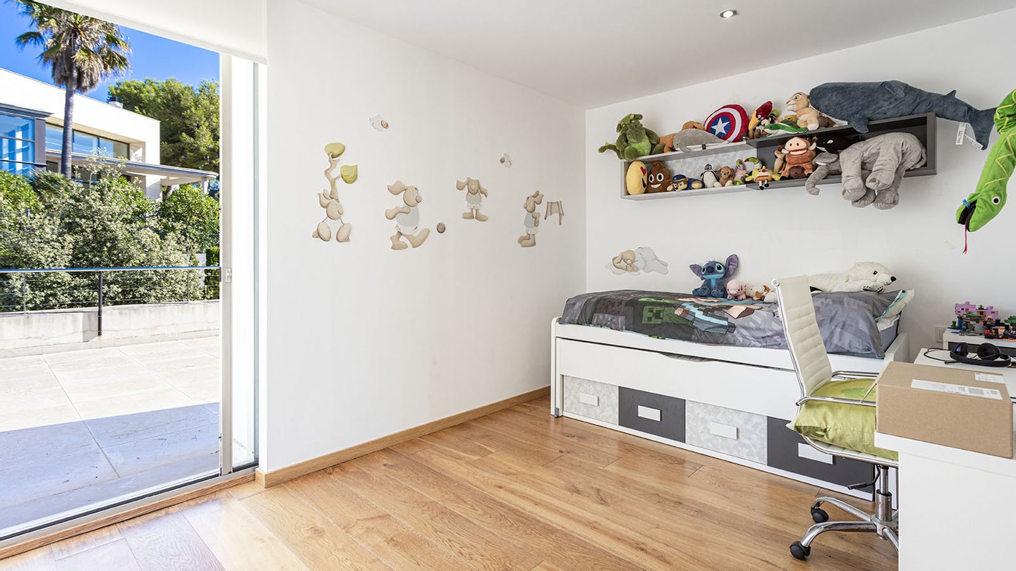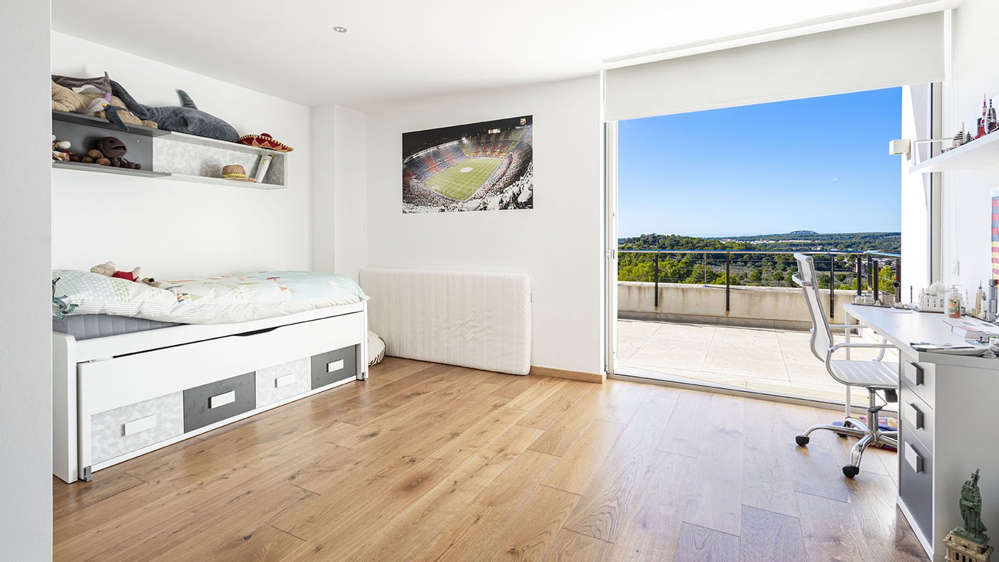 Stilvolle Villa mit Pool auf einem großzügigen Grundstück in einer ruhigen Wohngegend im Südwesten von Mallorca.Das perfekte Zuhause für die ganze Familie. Die moderne Villa befindet sich auf einem ca. 1.450 m2 großen Grundstück und verfügt über eine bebaute Fläche von ca. 440 m2. Auf 3 Etagen, die über eine Treppe miteinander verbunden sind, verteilen sich: 4 Schlafzimmer, 4 Badezimmer (3 davon en suite), Ankleide, ein Gäste-WC, ein Wohn-Esszimmer, ein weiteres Esszimmer, eine offene Einbauküche mit Elektrogeräten, ein Hauswirtschaftsraum, ein Abstellraum, sowie ein Keller. Der Einbau eines Aufzuges ist problemlos möglich. Insgesamt werden 3 Terrassen geboten, von denen man einen malerischen Weitblick auf die umliegende Natur und das majestätische Tramuntana-Gebirge genießen kann. Hier werden moderne Technik und mediterrane Designelemente harmonisch miteinander kombiniert. Für viel Wohnkomfort sorgen folgende hochwertige Ausstattungen: Fußbodenheizung, Klimaanlage, neueste Wärmepumpentechnologie, doppelt verglaste Aluminiumfenster, Solarenergie, Videoalarmanlage, Musikanlage, Einbauschränke, Parkettböden, 5 Tiefgaragenstellplätze, 2 weitere PKW-Stellplätze und vieles mehr. Der großzügige Außenbereich mit dem erfrischenden Pool und dem liebevoll angelegten Garten vervollständigen dieses einzigartige Angebot.