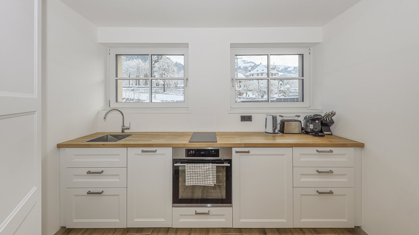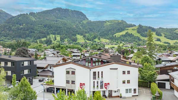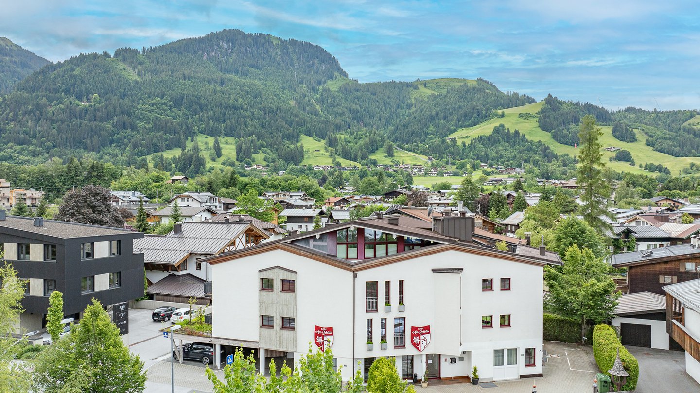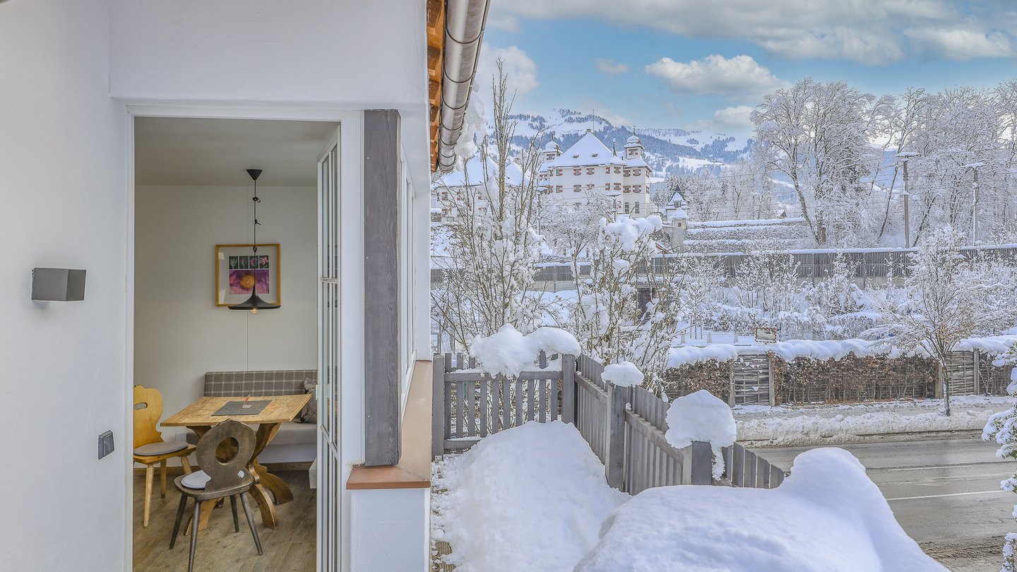 Die Suiten am Schloss liegen in sonniger Lage von Kitzbühel. Die Fußgängerzone, als auch die Skibushaltestelle ist in wenigen Gehminuten zu erreichen.