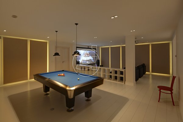 Die Gartenebene verfügt über ein Gästezimmer mit eigenem Bad, einen Wohnbereich, eine Unterhaltungszone, ein Heimkino, einen Weinkeller und eine Garage.