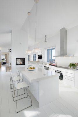 Im Erdgeschoss befindet sich ein geräumiges Wohnzimmer mit doppelter Raumhöhe und einem gemütlichen Kamin, ein separater Essbereich und eine voll ausgestattete offene Küche mit Siemens-, Miele- und Liebherr-Geräten.