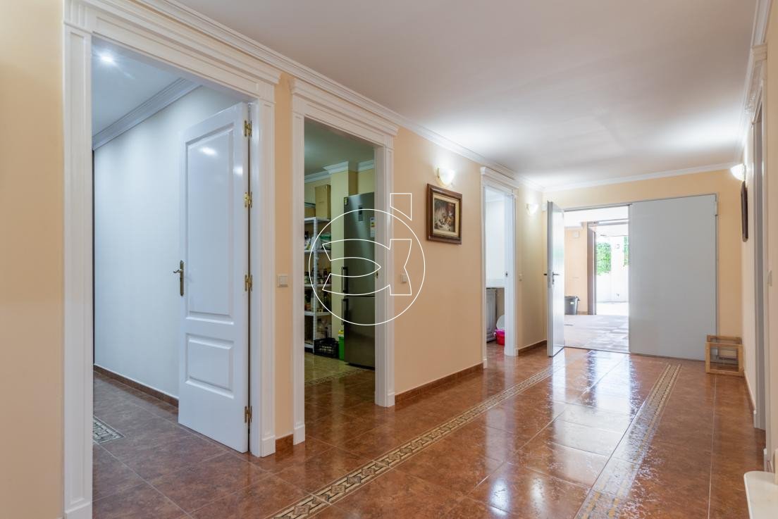 Das Erdgeschoss bietet verschiedene Lagerräume, einen Waschraum, eine Garage mit Platz für mindestens drei Autos, einen begehbaren Kleiderschrank, ein Gäste-WC und eine separate Gästewohnung mit eigenem Eingang von außen. Die Gästewohnung besteht aus einem Schlafzimmer, einem Badezimmer und einem Wohnbereich.