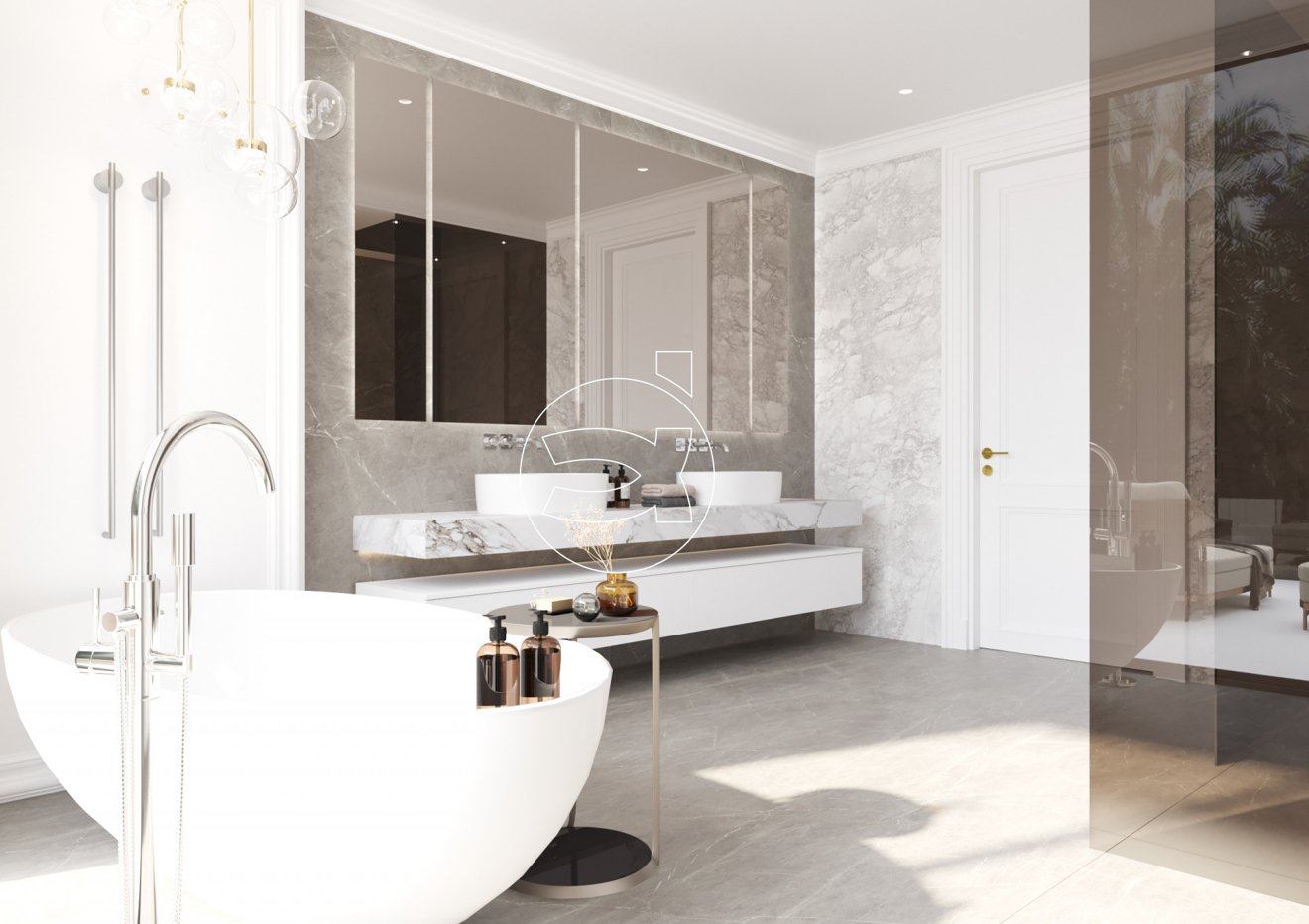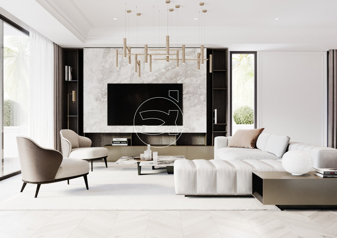 Die Villengrundrisse sind meisterhaft über drei Ebenen und eine Sonnenterrasse geplant und gipfeln in einem Meisterwerk mit sechs Schlafzimmern, das sich durch geschmackvolles Design auszeichnet und mehrere Bereiche zur Unterhaltung bietet.