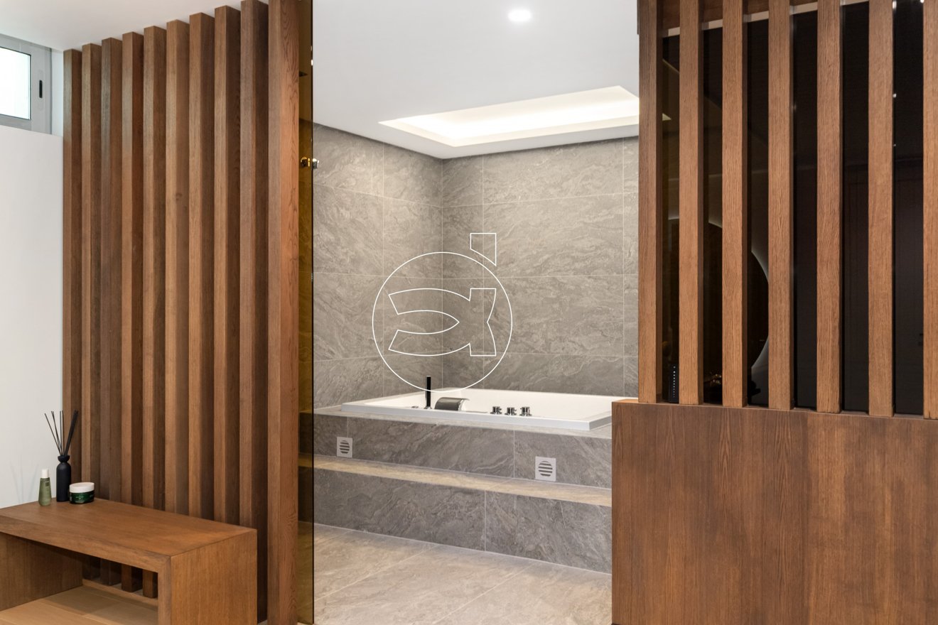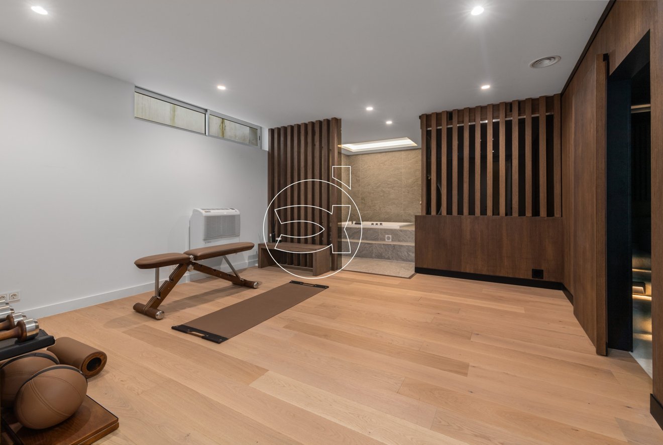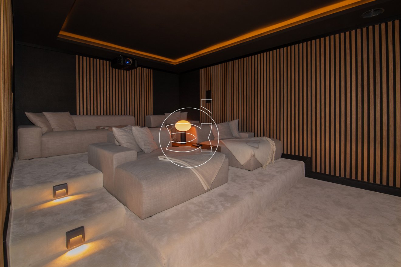 Insgesamt verfügt die Villa über fünf Schlafzimmer, davon eines im Erdgeschoss, drei im Obergeschoss und ein weiteres im Untergeschoss, sowie über einen Fitnessraum, einen Whirlpool, eine Sauna und einen Kinoraum.