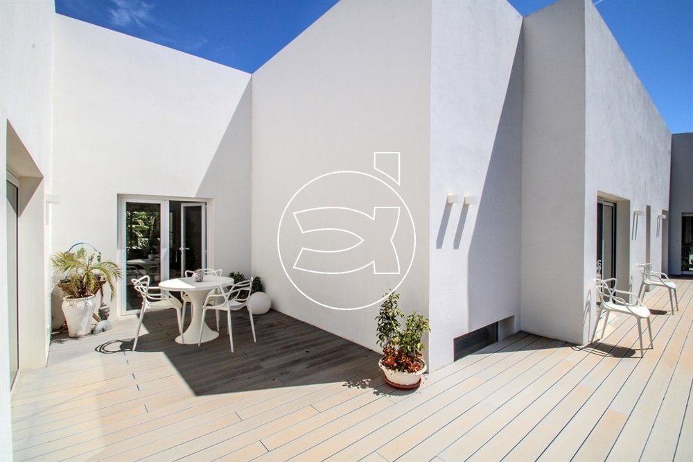 Des Weiteren finden Sie dort die Gartenterrasse, offenes Wohnzimmer mit Terrasse, offene Küche mit offenem Essbereich und zugehöriger Terrasse, Master Schlafzimmer mit Bad, Ankleideraum und Terrassenzugang, Gäste WC, zweites Wohnzimmer, Bürozimmer sowie Abstellraum.