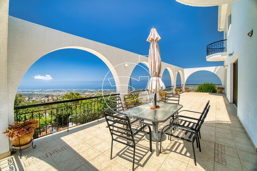 Die dreistöckige Villa mit fünf Schlafzimmern liegt in den Hügeln von Tala und bietet einen Panoramablick auf die Küste von Paphos vom internationalen Flughafen Paphos bis zu den Akamas.
