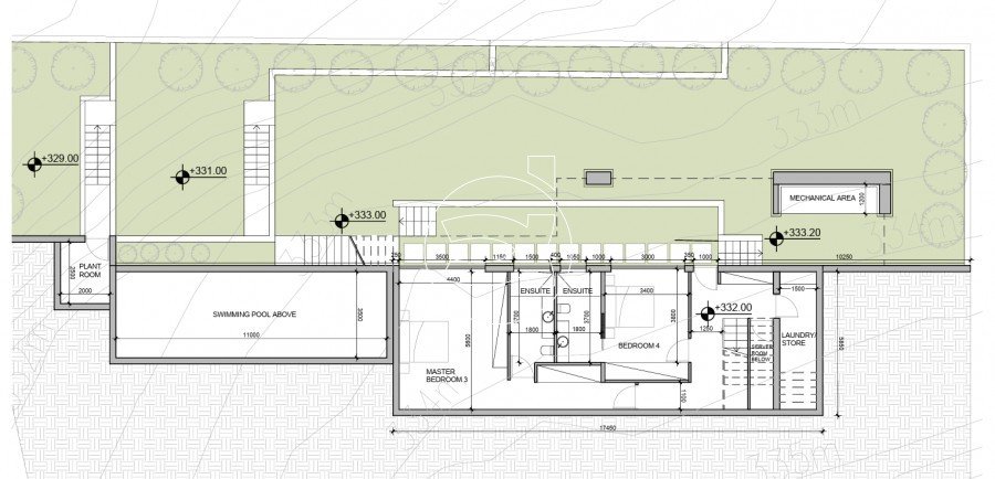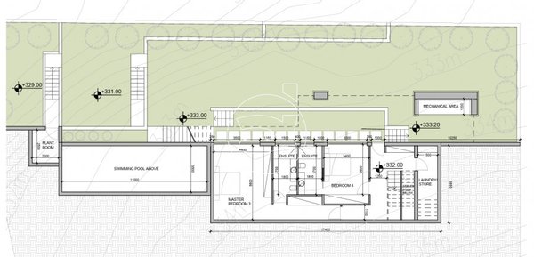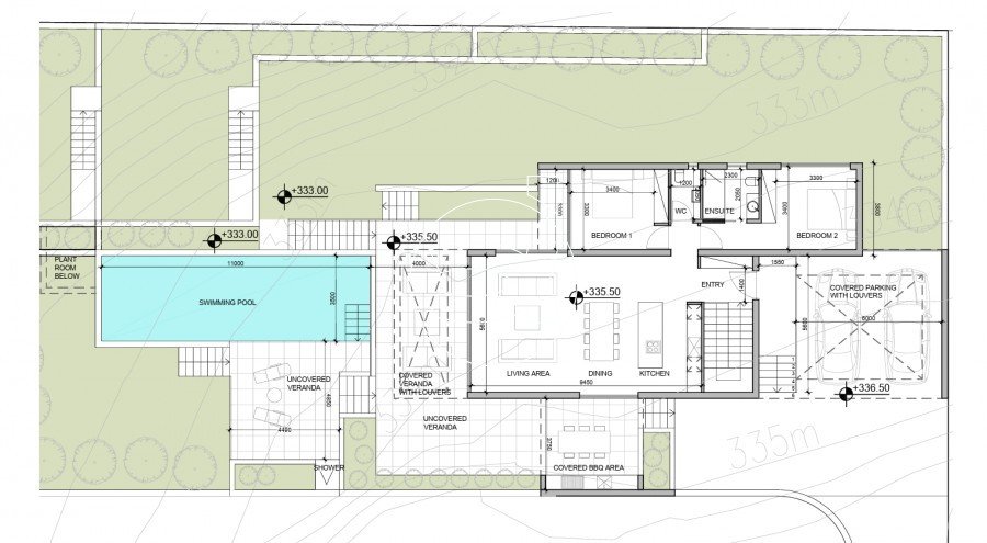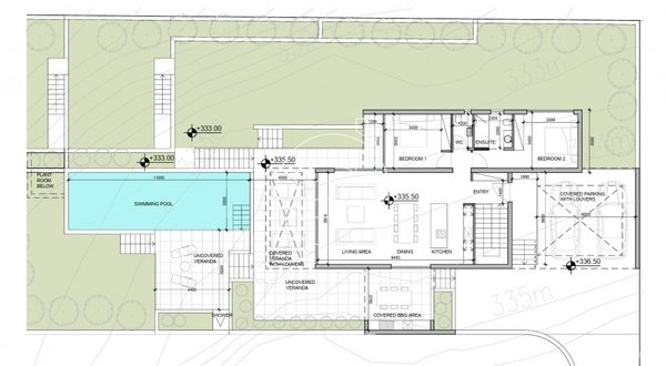 Draußen gibt es einen privaten Parkplatz für 2 Autos, einen Grillplatz auf der Ebene der Küche und einen Überlaufpool mit Landschaftsgarten. Fertigstellung - Mai 2025