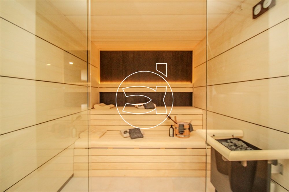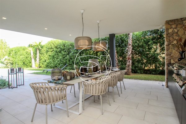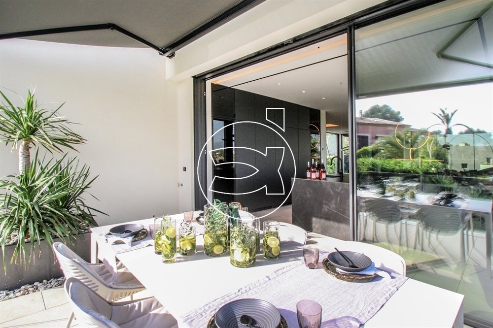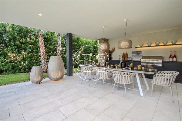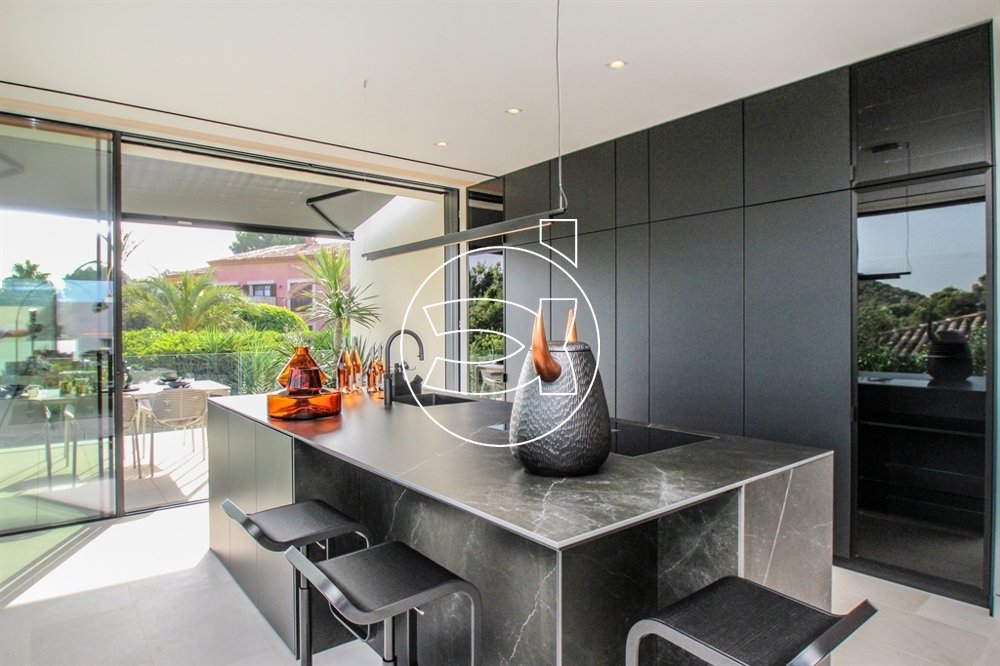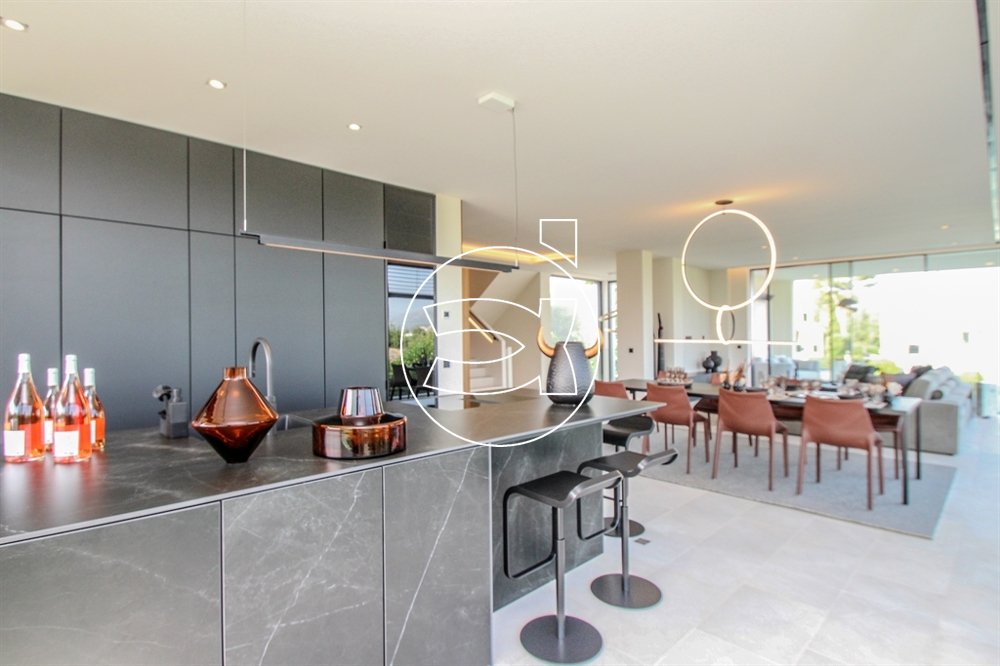 Die Luxusküche ist mit hochwertigen Küchengeräten, Bora Kochinsel und Weinkühler ausgestattet. Neben der Küche befindet sich eine großzügige überdachte Terrasse, wo man bis in die Nacht verweilen kann. Auf der anderen Seite des Wohn-Essbereichs gibt es eine weitere beheizte Terrasse, um auch an kühlen Tagen die Meerluft geniessen zu können.