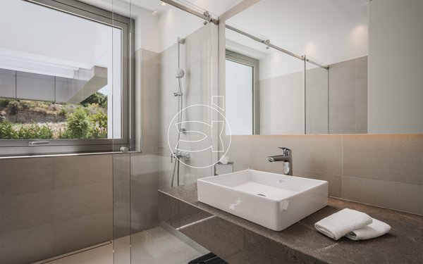 Das Obergeschoss erweitert den Luxus mit zusätzlichen Schlafzimmern, die jeweils über ein eigenes Bad und einen direkten Zugang zu einer Terrasse verfügen.