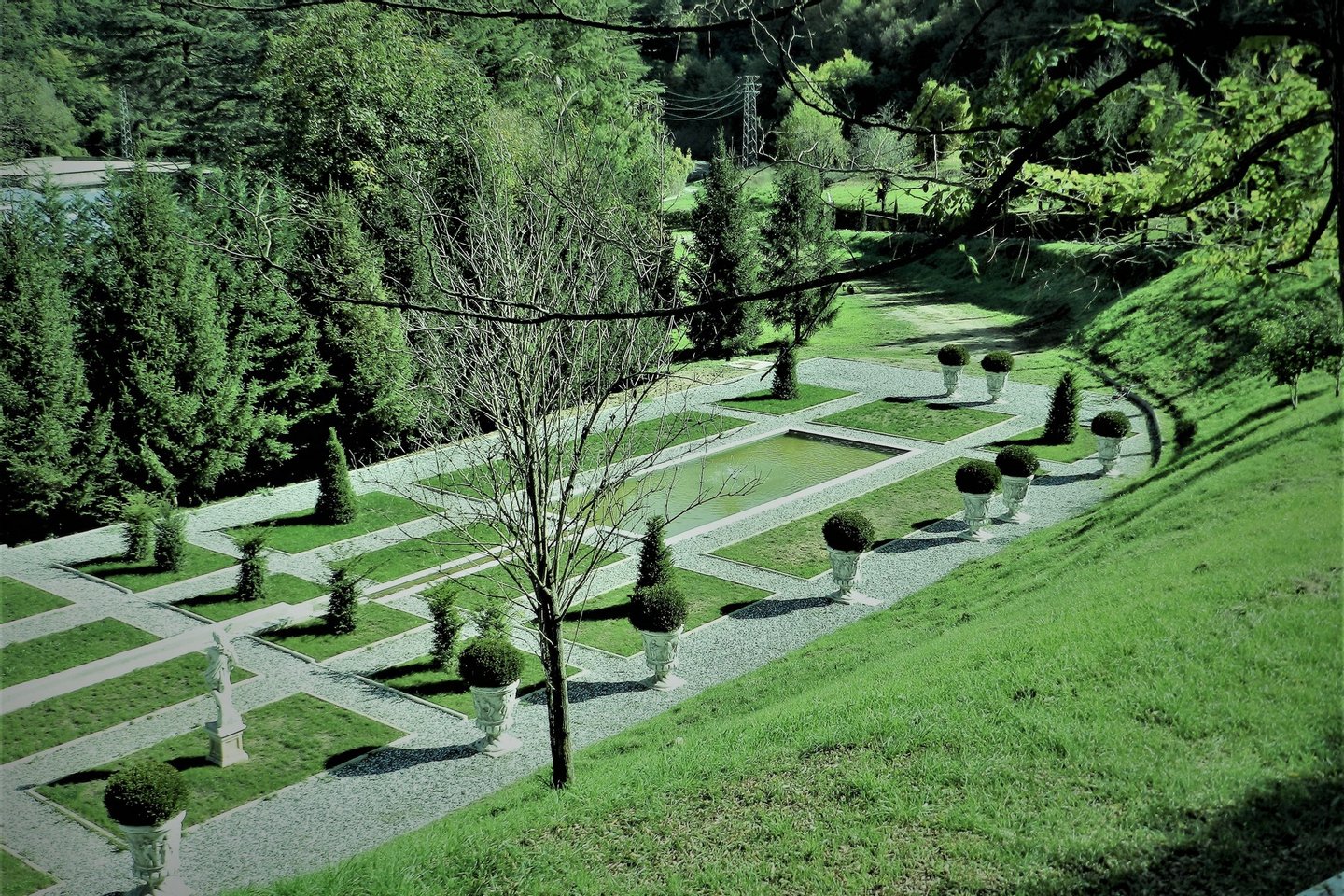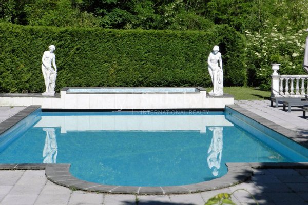 Der umliegende Park ist mit zwei Pools im Erdgeschoss, einem italienischen Garten, zwei Zugangstoren und einem großen Parkplatz geschmückt.