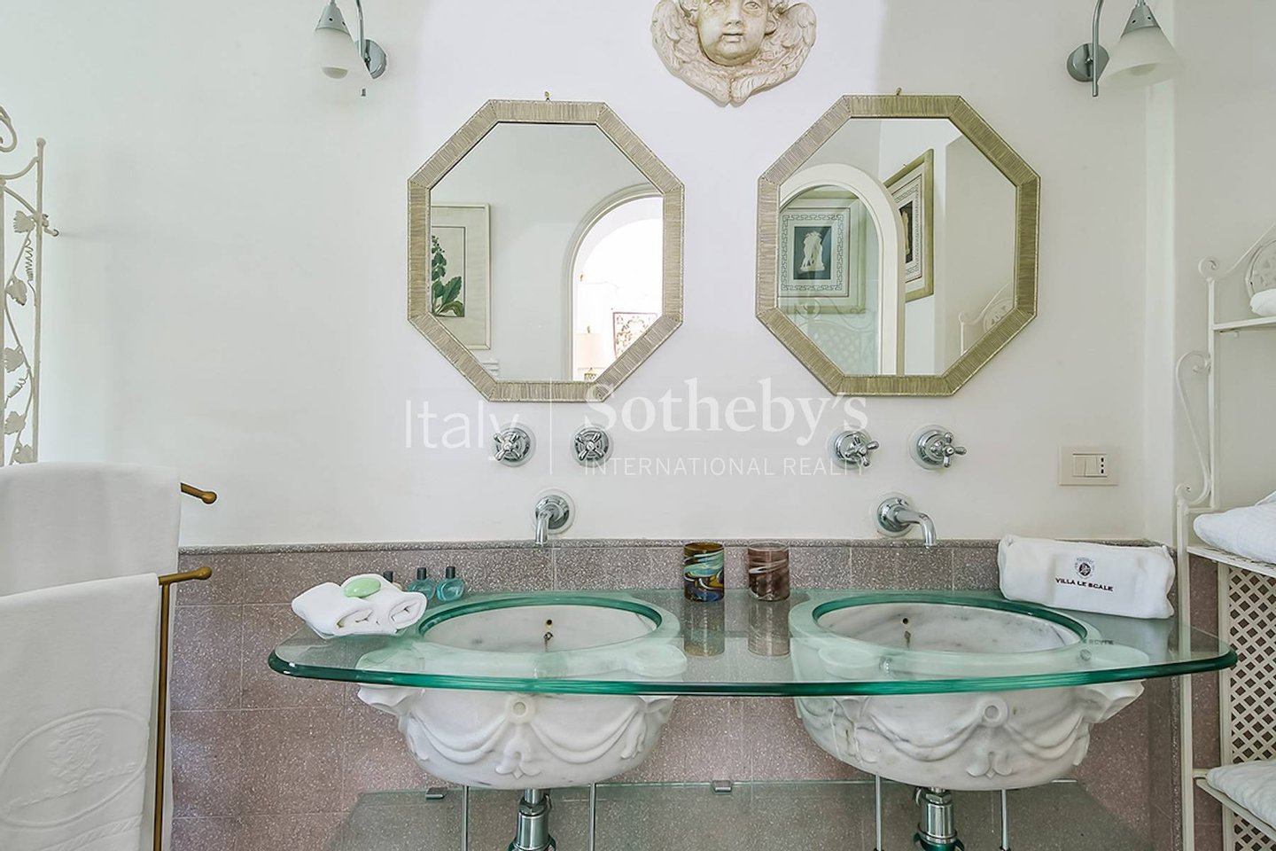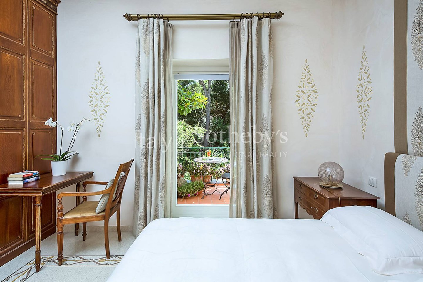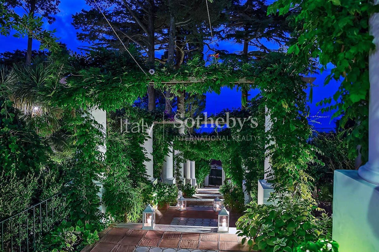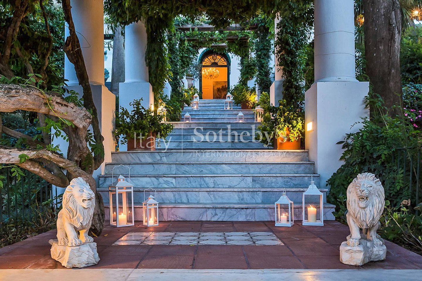 In der Villa Le Scale können Sie die ganze Geschichte von Anacapri atmen: Sie ist außergewöhnlich schön und eine der wenigen Residenzen aus dem 19. Jahrhundert auf Capri. Einst Sommerresidenz von Baron Monti delle Corte, der Familie, die die Vereinigung zweier königlicher Familien repräsentierte, wurde die Villa vollständig renoviert, wobei ihre historische und architektonische Vergangenheit erhalten blieb. Das Ergebnis ist ein Herrenhaus, das zu einem der luxuriösesten Rückzugsorte auf Capri geworden ist. Jahrhundertealte Bäume, Blumenbeete und ein entzückender, von Blumen umgebener Pool bilden die Kulisse für diese bezaubernde Villa. Eine elegante Treppe aus weißem Carrara-Marmor mit 45 Stufen führt zum Haupteingang des Hauses. Die Innenräume haben einen großen Wohnbereich, der durch angenehme Höhenunterschiede gebildet wird, wo die ursprünglichen Böden mit geometrischen Motiven hervorstechen. Die vorherrschenden Gewölbedecken und die feinste Einrichtung betonen die wunderbare Landschaft. Auf der gleichen Etage befindet sich eine gut ausgestattete Küche mit Vorratskammern und draußen eine bezaubernde Veranda, die vollständig von transparenten Glasscheiben umgeben ist, die den Blick auf das Meer nicht behindern. Die Villa besteht aus 5 wunderschönen Schlafzimmern, wunderschön im romantischen Stil eingerichtet, mit einer exklusiven Terrasse und 5 eleganten Badezimmern, die sich im Obergeschoss befinden, sowie 2 Nebengebäuden mit 2 weiteren Schlafzimmern mit Badezimmer im Garten. Ausgestattet mit Technikräumen, Lagern und Keller im Untergeschoss. Die Lage der Villa ermöglicht es Ihnen, das Zentrum von Anacapri mit allen Dienstleistungen, Taxi- und Busstationen in alle Richtungen, das Museum der Villa S. Michele und den Sessellift zum Monte Solaro in nur 3 Minuten zu Fuß zu erreichen. Der Hubschrauberlandeplatz ist ebenfalls nur 1,5 km entfernt.