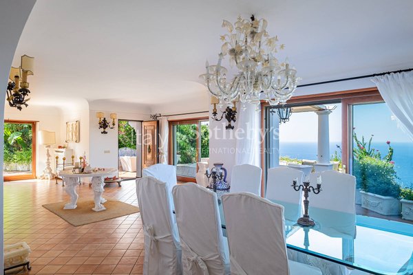 Eine prächtige Villa in der bezaubernden Cala del Rio in Anacapri. Diese Immobilie empfängt Sie bereits bei Ihrer Ankunft mit ihrer Majestät. Das Anwesen erstreckt sich über zwei Etagen und bietet einen atemberaubenden Blick auf das Meer und die üppige grüne Umgebung. Im unteren Stockwerk finden Sie ein großes und helles Wohnzimmer, eine voll ausgestattete Küche, ein Esszimmer und ein Gästebadezimmer. Alle Räume öffnen sich zu einer beeindruckenden Terrasse, von der aus Sie wundervolle Sonnenuntergänge genießen können. Im oberen Stockwerk gibt es vier elegante Schlafzimmer, jeweils mit eigenem Badezimmer. Die Immobilie verfügt auch über einen Außenbereich mit Fitnessstudio und das Herzstück des Hauses, einen großen Pool, ideal zum Entspannen und die Aussicht zu genießen. Die Villa bietet außerdem zahlreiche Parkplätze, um den Komfort der Gäste zu gewährleisten.
