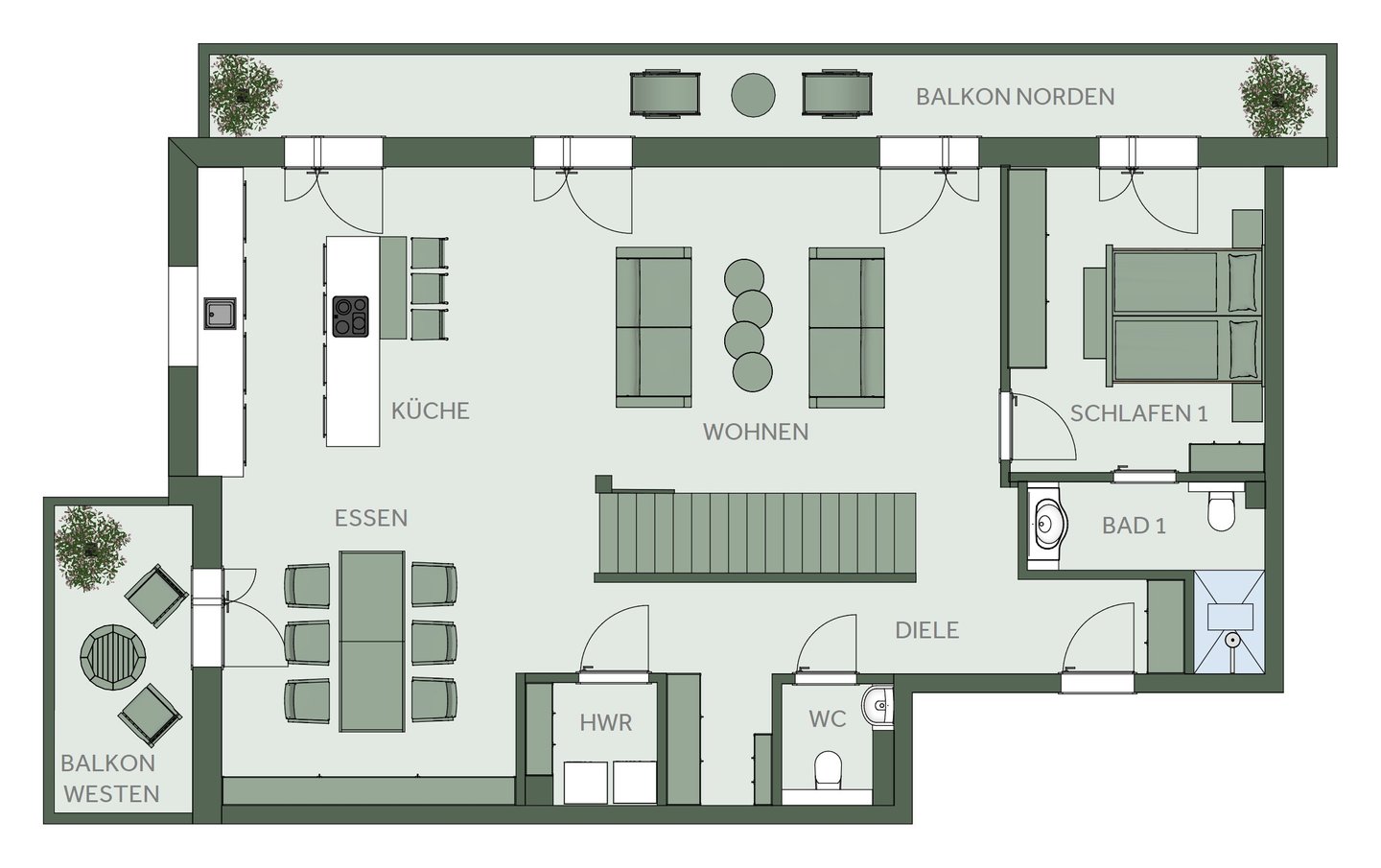 Die 3 Balkone sind nach Nord-West ausgerichtet, mit wunderschönem