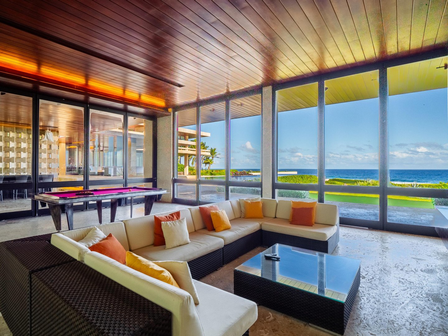 Treten Sie ein in Ihre eigene private Oase. Tauchen Sie ein in den 160.000 Gallonen fassenden Infinity-Pool mit einer luxuriösen Badewanne für 12 Personen, die einen perfekten Rückzugsort zum Entspannen und Verjüngen bietet. ♂️ ♀️ Entspannen Sie sich an einer der beiden Bars oder fordern Sie Freunde zu einer Runde Minigolf auf dem 9-Loch-Platz heraus. ⛳️♂️