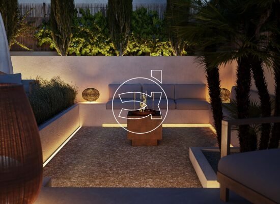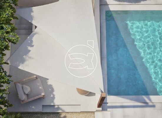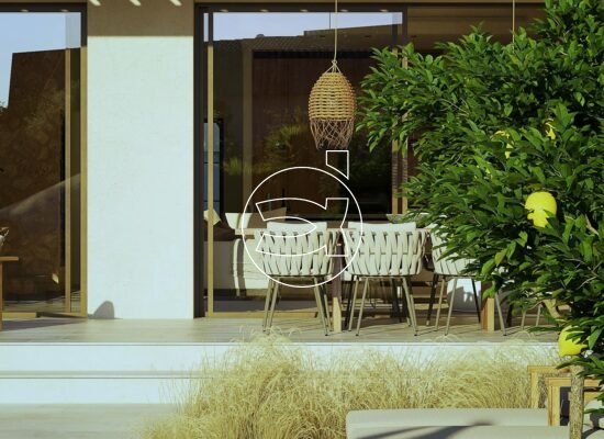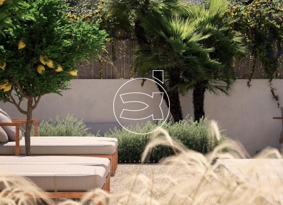 Ein direkter Zugang über den großzügigen Garten, umgeben von Palmen und Zitronenbäumen, führt zu einem Esszimmer für den Sommer sowie zahlreichen Solarien und Entspannungsbereichen, um sonnige Tage und Abende an der frischen Luft zu genießen.