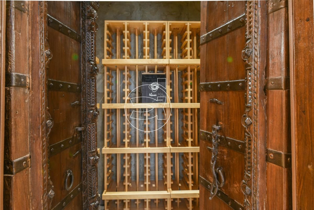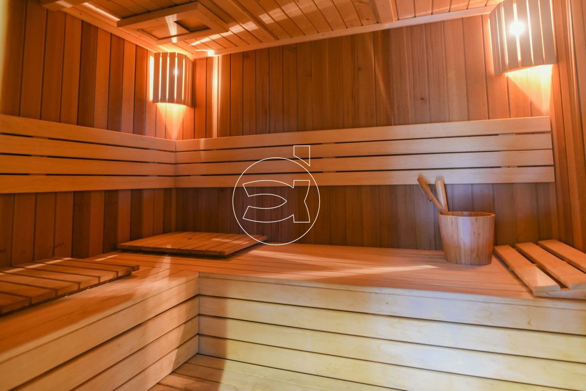 Die untere Ebene bietet Unterkunft für Gäste oder Personal mit einer Küche, einem zusätzlichen Schlafzimmer, einer Gästetoilette, einer Gästegarderobe, einer zusätzlichen Schlafecke und einer Gästetoilette. Ein weiteres Schlafzimmer, eine Weinkeller-Ecke und ein großer Indoor-Spa mit Infrarotsauna und Dampfbad.