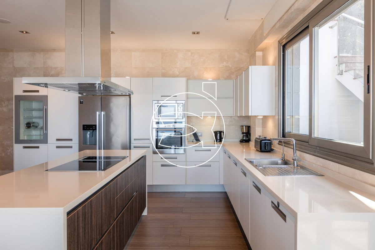 Die moderne Küche verfügt über weiße Hochglanzschränke, eine zentrale Insel, einen amerikanischen Kühlschrank, einen Weinkühler und vieles mehr. Zwei weitere großzügige Schlafzimmer mit eigenem Bad und Einbauschränken befinden sich auf dieser Ebene, jedes mit Zugang zur Terrasse, von der aus eine wunderbare Aussicht hat geboten wird.