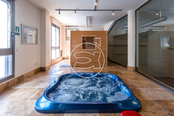 Auf der unteren Etage finden Sie einen fantastischen Freizeitbereich mit einem voll ausgestatteten Fitnessraum, einem Whirlpool, einer Sauna und einem Duschraum sowie einer praktischen Waschküche.