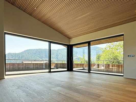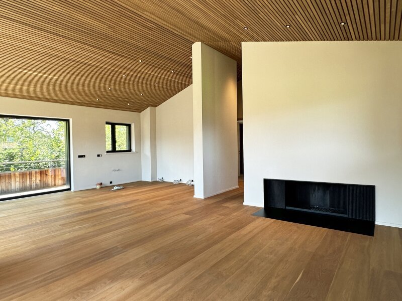 Im Obergeschoss befindet sich ein weiteres Schlafzimmer samt Bad, die Gästetoilette sowie ein offener Wohn-Essbereich mit Kamin, Küche und prachtvollem Sichtdachstuhl. Breite Balkone Richtung Süden und Westen laden zum Genießen im Freien ein.