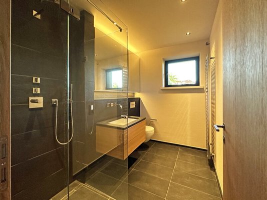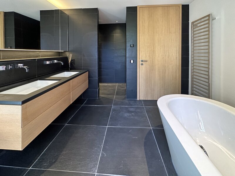 Durch die sanfte Hanglage verfügt der Wellnessbereich im Untergeschoss einen direkten Zugang zum Garten - diverse Abstell- und Haustechnikräume komplettieren das Raumangebot.