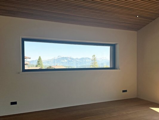 Große Fensterflächen geben Blickachsen frei und sorgen für lichtdurchflutete Räume. Die verwendeten Materialien im Innenausbau sind überwiegend Eichenholz und Naturstein, wodurch der Charakter des Tiroler Stils zum Leben erweckt wird.