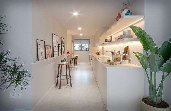 Die Küche wird voll möbliert und ausgestattet mit Backofen, Induktionsherd und einer Dunstabzugshaube. Die Bäder sind mit hängend installierten Waschtischen aus Holz, Dusche mit bodengleicher Duschtasse und Unterputzarmaturen ausgestattet. Für alle Räume der Wohnungen wurden großformatige Porzellanfliesen ausgewählt. Im Außenbereich werden die gleichen Fliesen in der rutschfesten Version verlegt. Die Fußbodenheizung in allen Räumen garantiert höchsten Wohnkomfort. Zu jeder Immobilie gehört ein eigener Parkplatz mit direktem, individuellem Zugang. Zu den weiteren Ausstattungsmerkmalen gehören Gemeinschaftspool, Gemeinschaftsgärten, Privatgärten, Klimaanlage, Aerothermie, solarthermische Paneele, LED-Strahler, doppelt verglaste Fenster sowie Vorinstallation für Elektrofahrzeuge.