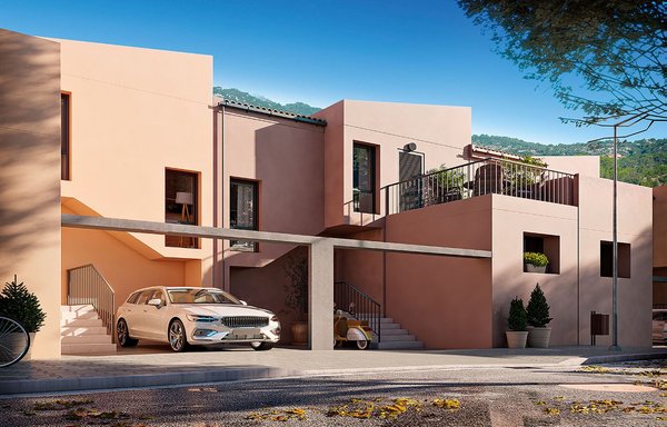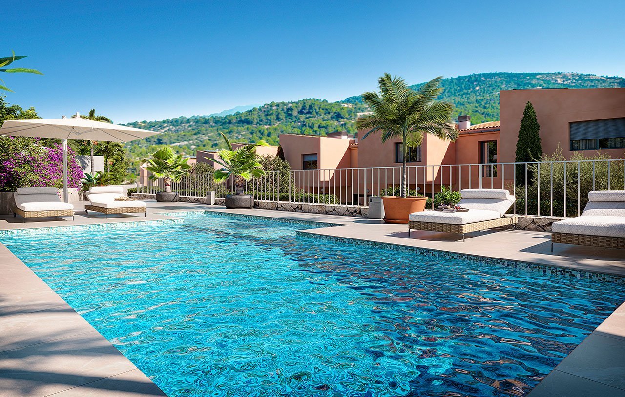 Die Wohnanlage zu Füßen der Serra de Tramuntana besteht aus nur 13 Reihenvillen über zwei Etagen im authentischen Baustil mallorquinischer Dorfhäuser. Jede Immobilie hat 3 Schlafzimmer, 2 Bäder (1 en-suite) und ein Gästebad. Die Immobilien verfügen über einen großzügigen, zur Terrasse offenen Wohn-/Essbereich und eine voll eingerichtete Küche. Die Terrassen aller Häuser sind nach Südwesten ausgerichtet und haben einen eigenen Garten, mit Zugang zum schön angelegten, begrünten Gemeinschaftsbereich mit Pool.