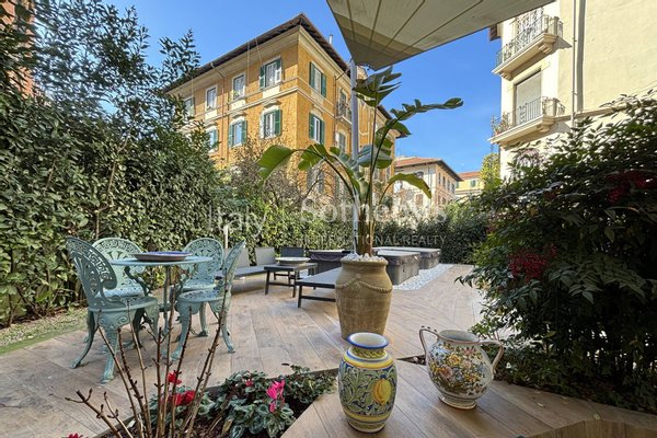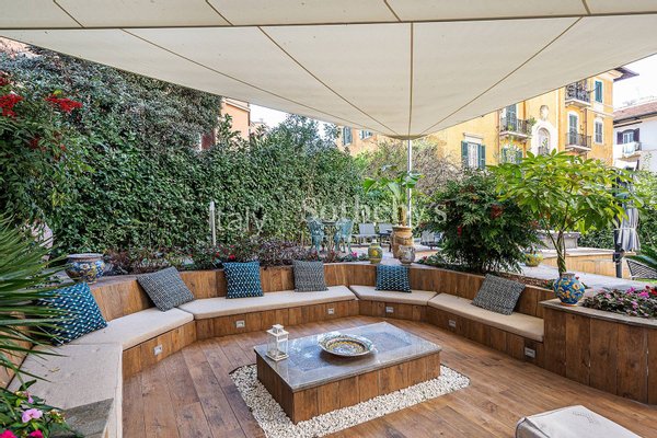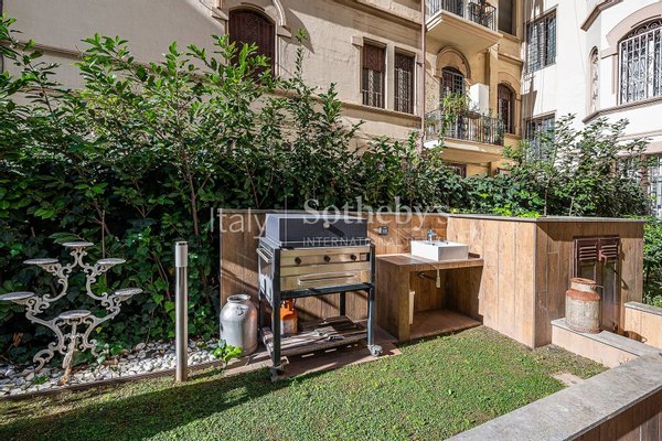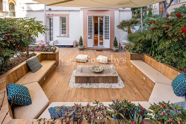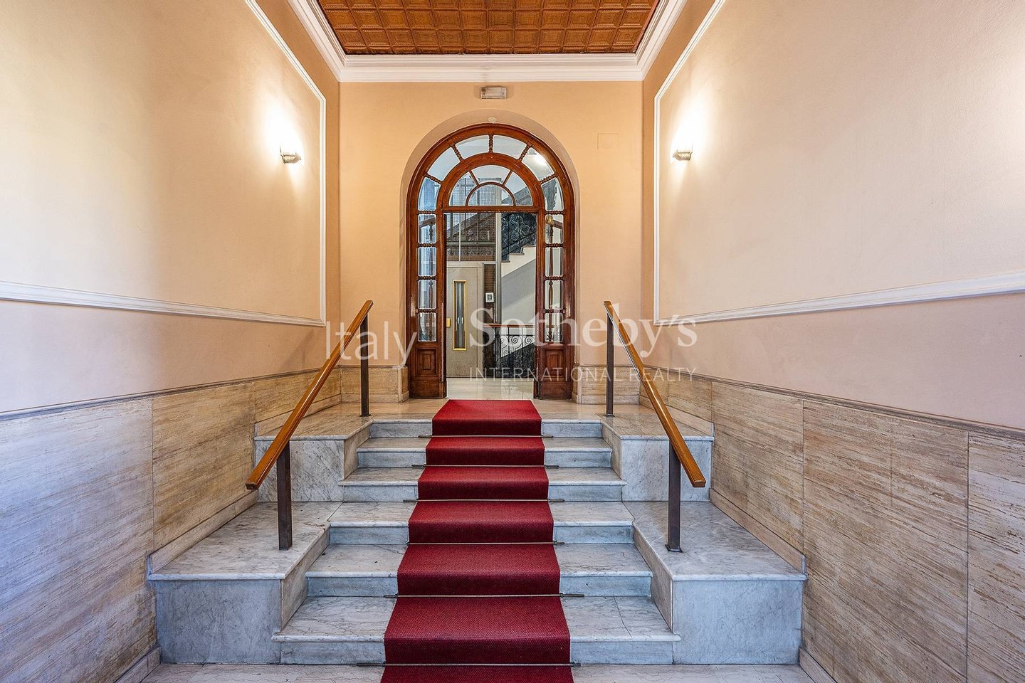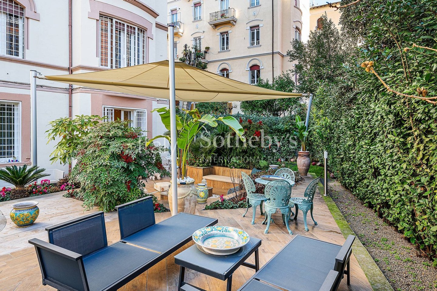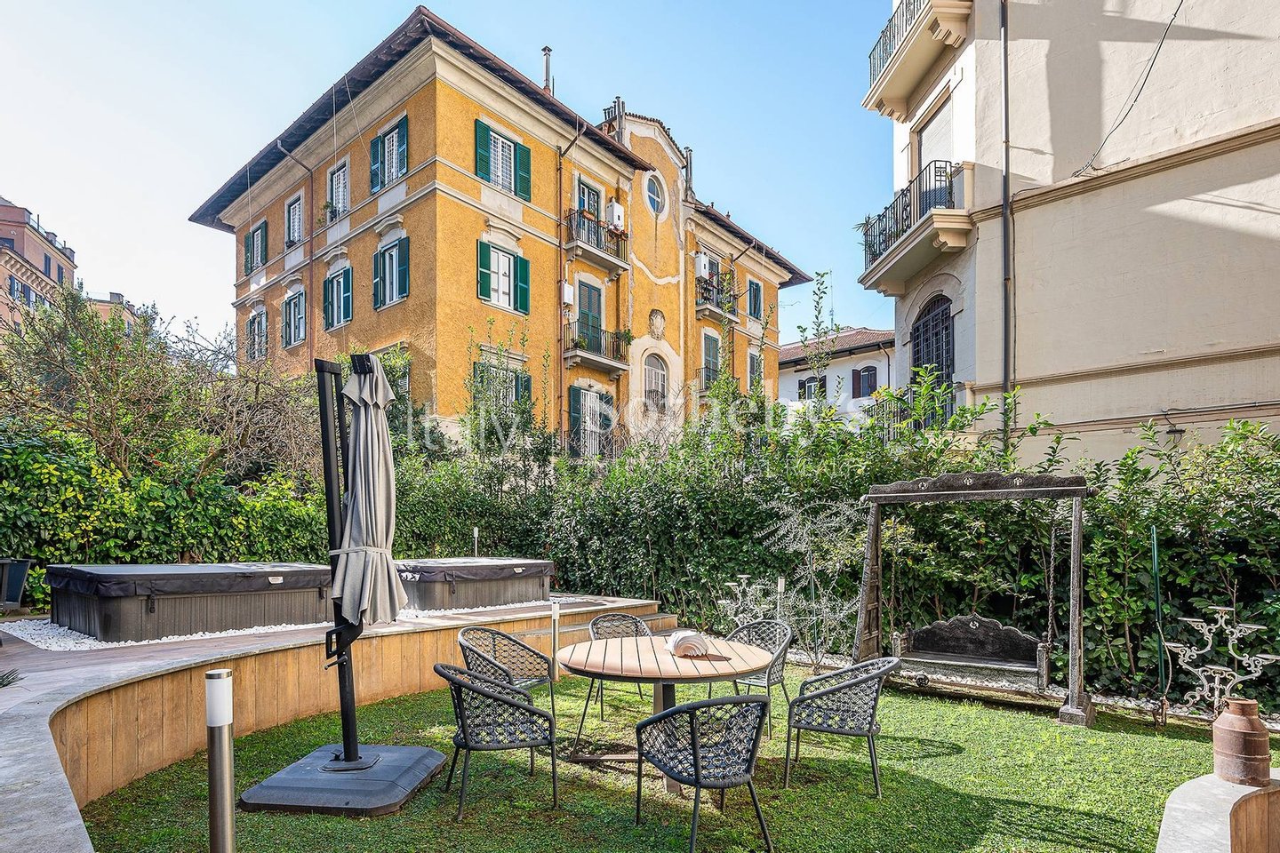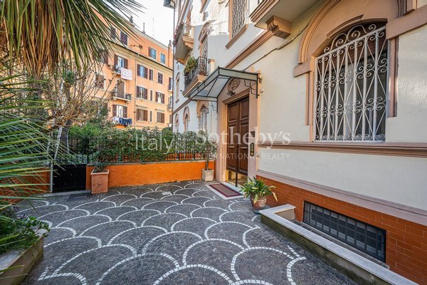 In einem eleganten Gebäude aus dem Jahr 1930 im Viertel Parioli befindet sich eine exklusive Wohnung von etwa 300 Quadratmetern mit einem 350 Quadratmeter großen Garten.