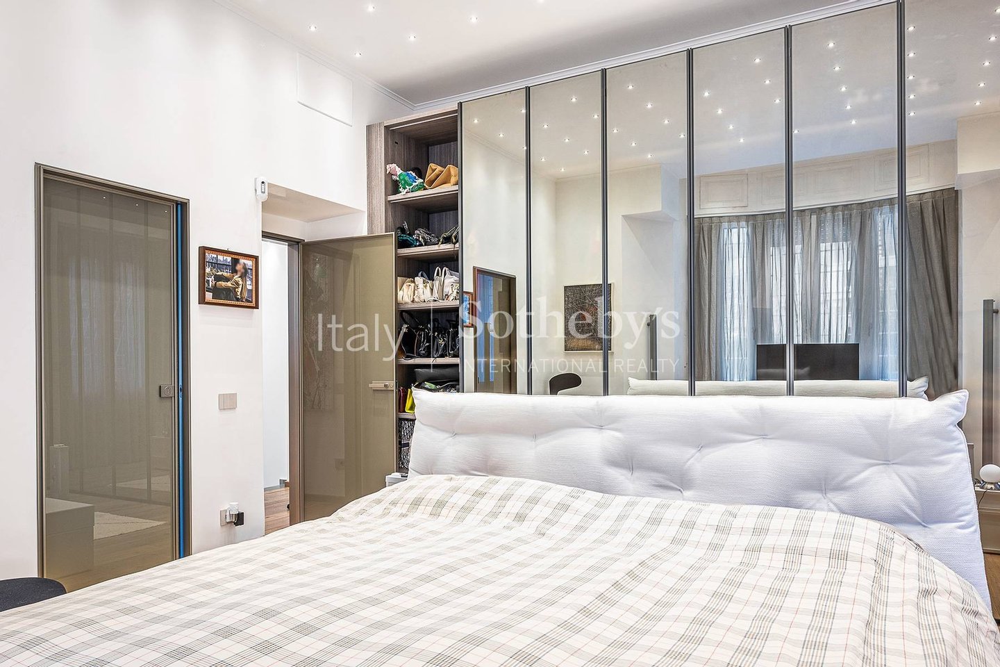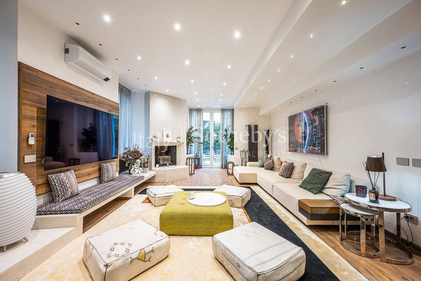 In einem eleganten Gebäude aus dem Jahr 1930 im Viertel Parioli befindet sich eine exklusive Wohnung von etwa 300 Quadratmetern mit einem 350 Quadratmeter großen Garten. Die elegante und raffinierte Renovierung im Jahr 2021 hat die Innen- und Außenbereiche aufgewertet und modernisiert, wodurch die Immobilie zu einem perfekten Zuhause für diejenigen wurde, die einen großzügigen Wohnraum suchen. Auf zwei Ebenen entwickelt, zeichnet sie sich durch drei Zugänge aus: vom Garten, vom Wohnbereich und von der Schlafzimmerebene. Der einladende Eingang führt in das große Wohnzimmer mit Kamin und den Essbereich. Die hochmoderne, voll ausgestattete Küche neben dem Wohnzimmer und ein Gästebad machen den Bereich funktional und gemütlich. Große Fenstertüren führen in den wunderschönen und gepflegten Garten mit marokkanischer Ecke, Essbereich mit Grill, Spielbereich und zwei Whirlpools. Eine breite und bequeme Treppe führt in die obere Etage, wo sich das große Hauptschlafzimmer mit eigenem Bad, zwei Schlafzimmer mit Zwischengeschossen, ein Schlafzimmer mit Balkon, ein begehbarer Kleiderschrank mit Arbeitsbereich und ein weiteres geräumiges Bad befinden. Elegante Einbauschränke sind im gesamten Haus vorhanden. Die fest installierte Einrichtung, die im Verkauf enthalten ist, ist dank hochwertiger Materialien von hoher Qualität. Alle Installationen sind modern, die Fußbodenheizung ist autonom und wird durch Designheizkörper ergänzt. Einbruchmeldeanlagen, Klimatisierung und Smart-Home-Systeme sind vorhanden. Eine Waschküche und ein Personalzimmer mit Bad runden das Angebot ab. Die Wohnung profitiert von einer herrlichen Ausrichtung, die den ganzen Tag über angenehmes Tageslicht ermöglicht. Ein überdachter Parkplatz mit Aufzug kann separat erworben werden.