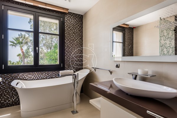 Diese moderne Villa befindet sich auf einem 4037 m² großen Grundstück und bietet einen weiten Blick auf das Mittelmeer, die afrikanische Küste und den berühmten Berg La Concha in Marbella.