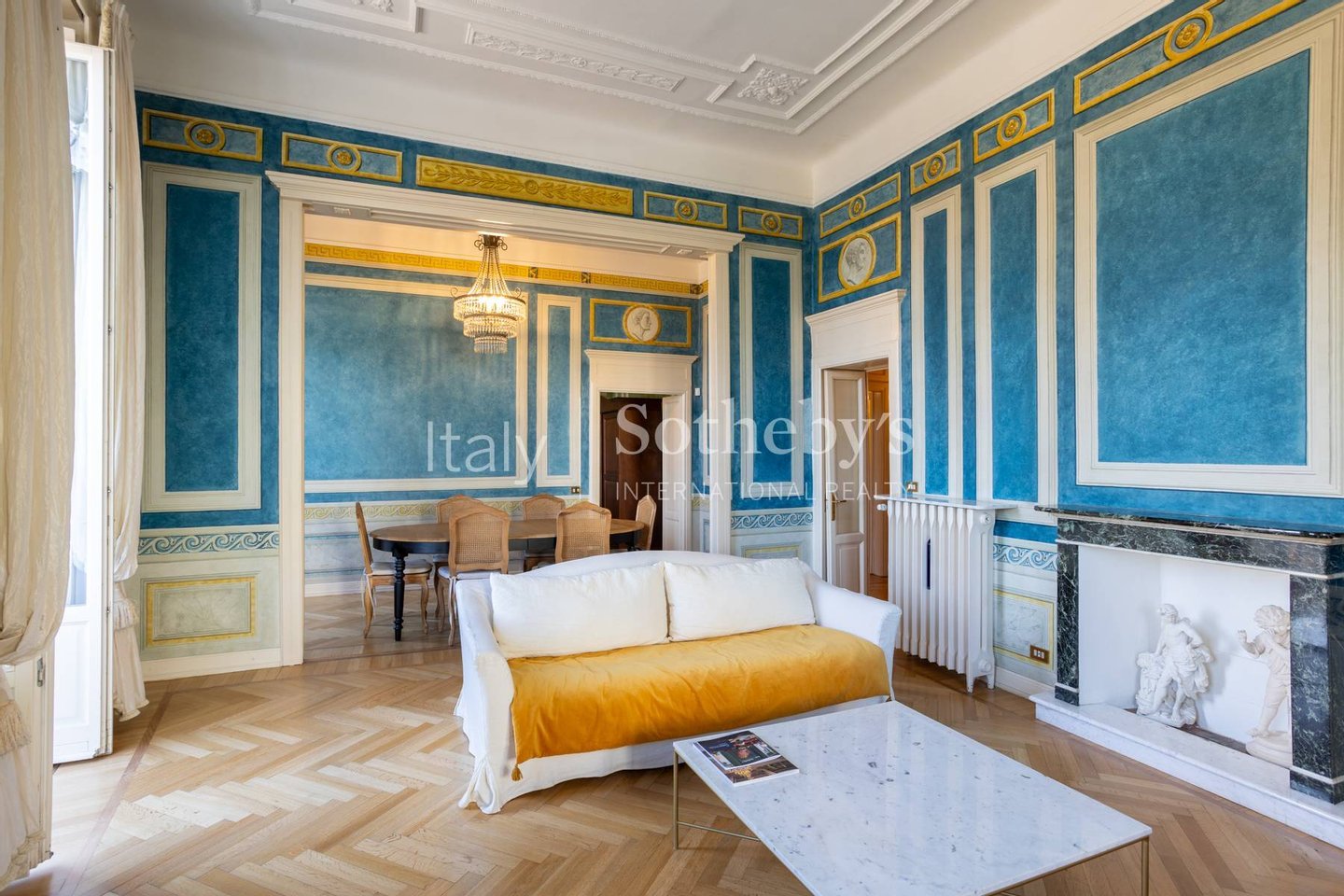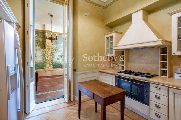 The apartment, located on the first floor of an elegant building, overlooks the charming town's lakefront. The finely restored frescoes that characterize the property decorate the walls, transporting guests to a bygone era of great artistic splendor. The herringbone flooring, a rare and prized feature, conveys an impression of opulence and sophistication with every step. The luxurious marble-clad bathrooms, embellished with gold details, offer an experience of unparalleled well-being and comfort. The main living room welcomes with its majesty, offering generous spaces for relaxation and entertainment. The grand entrance hall, with its sumptuous decorations, creates an impression of prestige from the first moments.