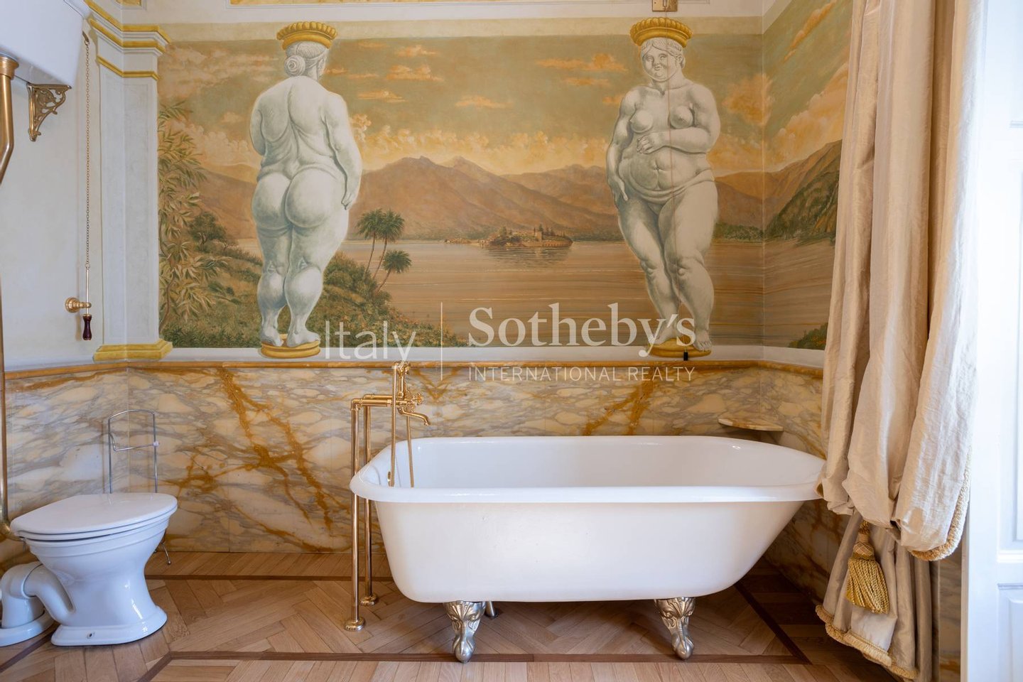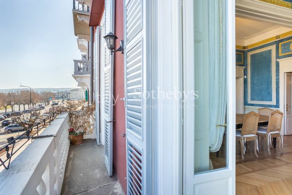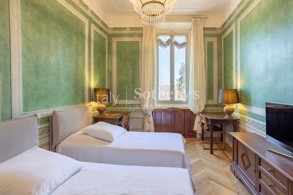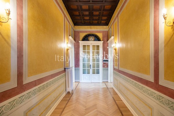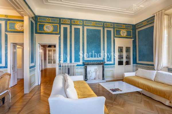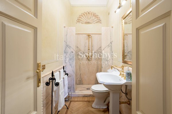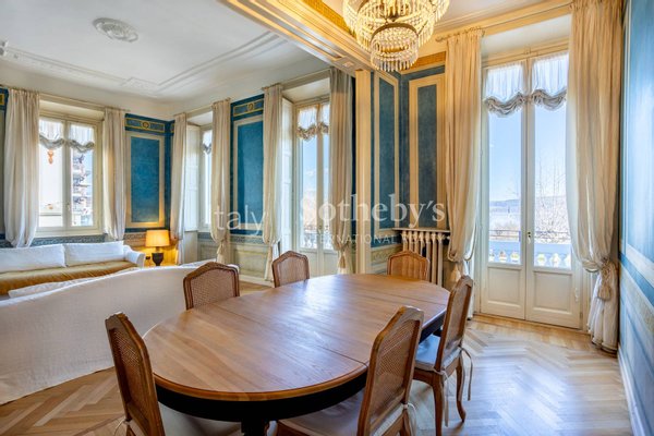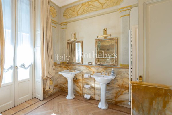 The apartment, located on the first floor of an elegant building, overlooks the charming town's lakefront. The finely restored frescoes that characterize the property decorate the walls, transporting guests to a bygone era of great artistic splendor. The herringbone flooring, a rare and prized feature, conveys an impression of opulence and sophistication with every step. The luxurious marble-clad bathrooms, embellished with gold details, offer an experience of unparalleled well-being and comfort. The main living room welcomes with its majesty, offering generous spaces for relaxation and entertainment. The grand entrance hall, with its sumptuous decorations, creates an impression of prestige from the first moments.