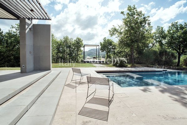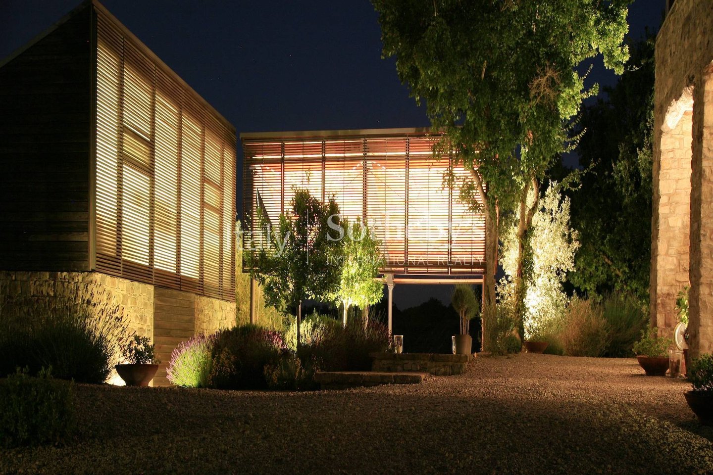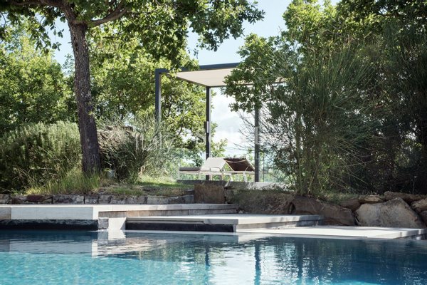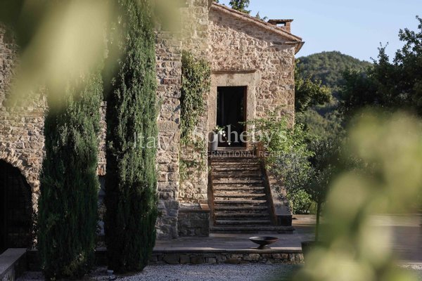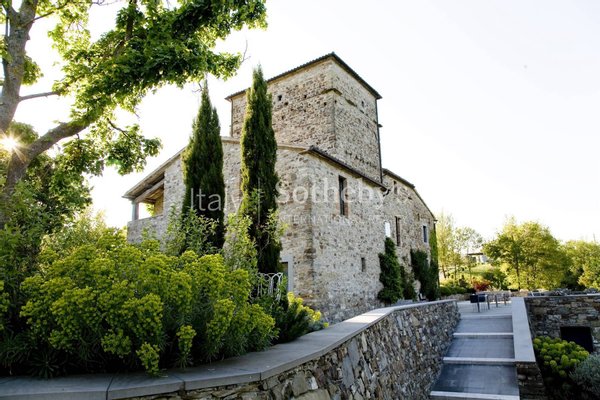 The outbuildings, gardens, terraces, and a 25-meter pool are aligned on an axis with the tower.