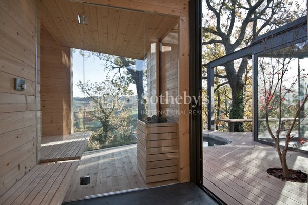 The suites are designed with a special focus on nature, featuring underfloor heating and chilled floors powered by solar energy. The main tower is a majestic suite with a mezzanine library overlooking the valley. Other suites are distributed in the central tower, each with unique features and panoramic views. There is a Forest Suite and SPA in the surrounding forest, a 3 minute walk to the tower.