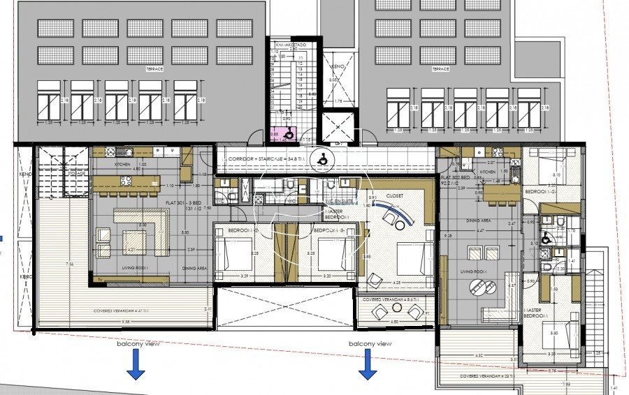 Die Wohnungen im obersten Stockwerk (Penthäuser) haben geräumige private Terrassen mit einem zusätzlichen Raum und einer Sauna.