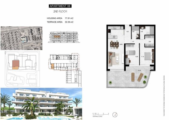 Die reizvolle kleine Anlage liegt ca. 2,5 km vom Strand entfernt und in nur ca. 600 m Entfernung findet man einen Supermarkt und ein kleines Einkaufszentrum mit diversen Einzelhandelsgeschäften sowie Bars und Restaurants. Alle weiteren Versorgungsmöglichkeiten findet man in La Zenia, wo sich auch das schöne Einkaufszentrum Zenia Boulevard befindet, in Villamartín oder auch im Zentrum von Torrevieja.