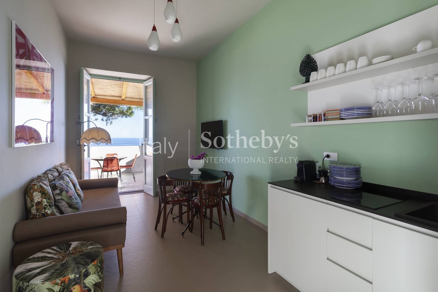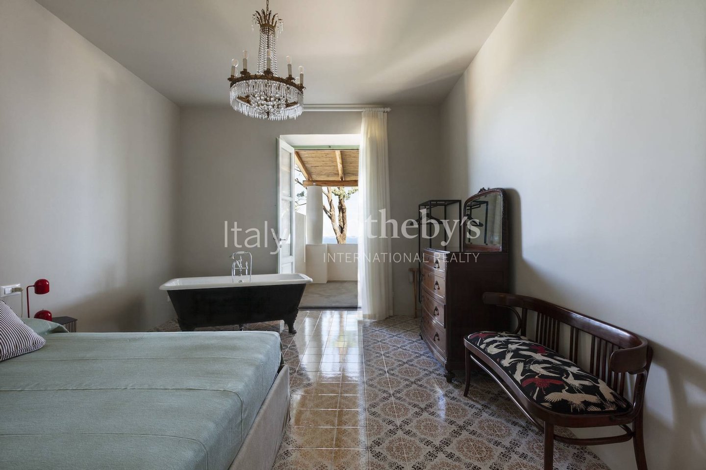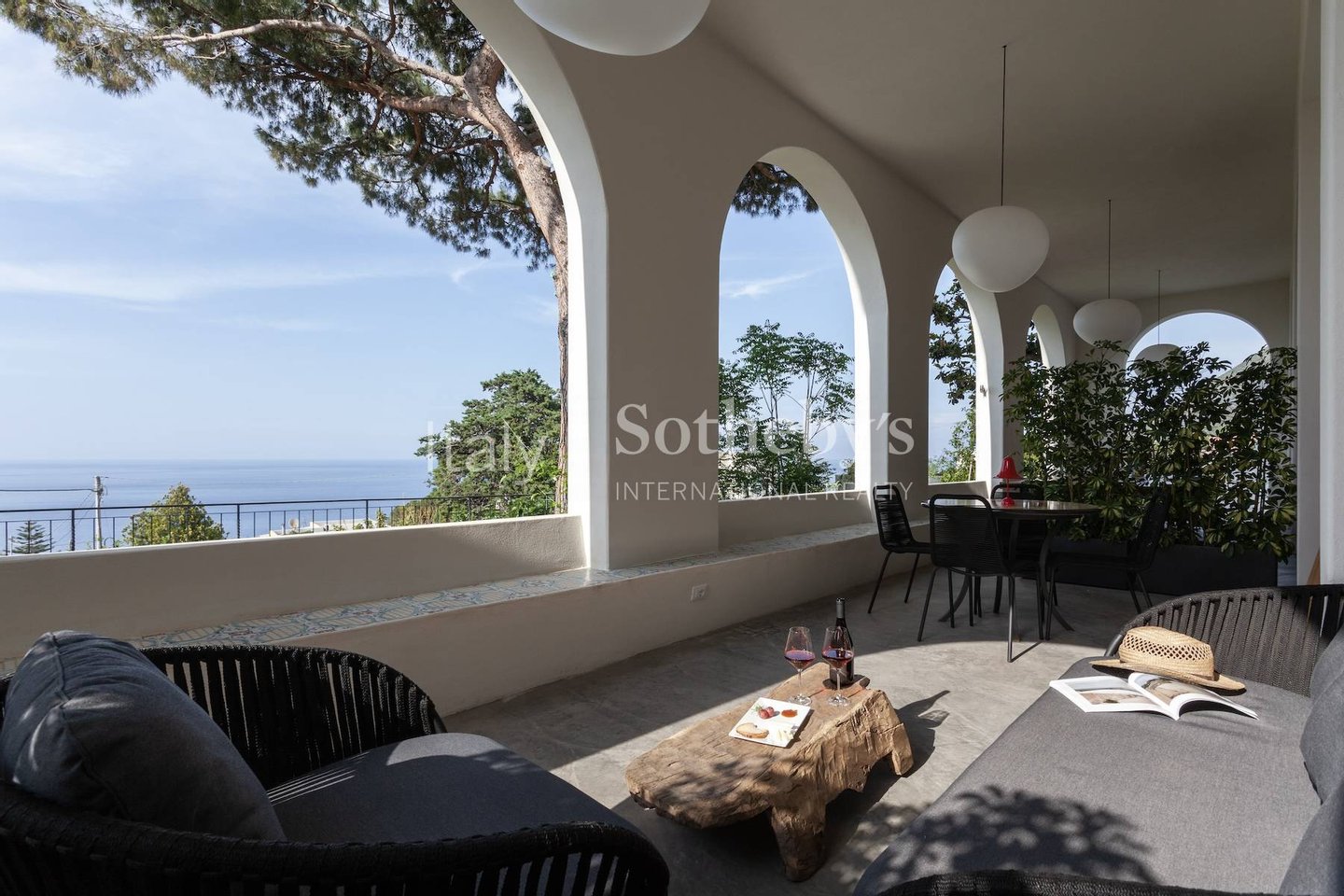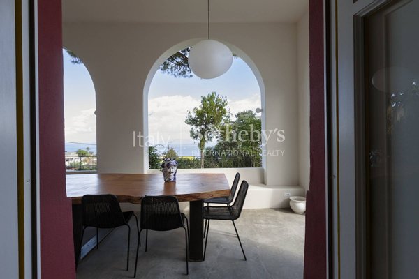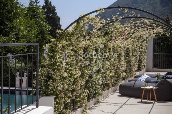 From the portico, ideal for dining or relaxing while enjoying the splendid view of the village rooftops and the azure sky and sea, you can access the garden. Citrus plants and fragrant flowers frame the 12-meter-long and 6-meter-wide infinity pool and the surrounding area, equipped with a bar and pergola for al fresco dining.
