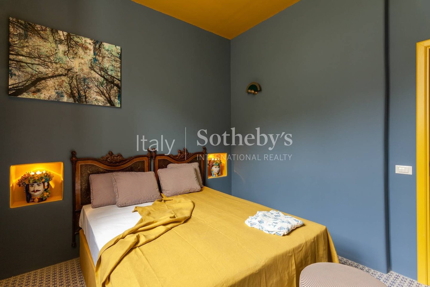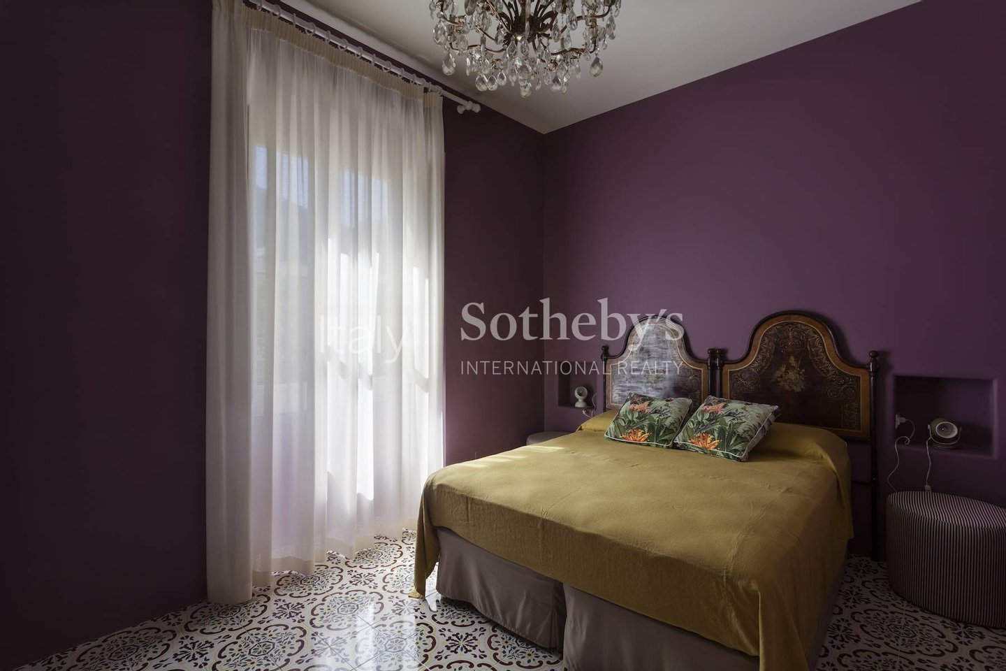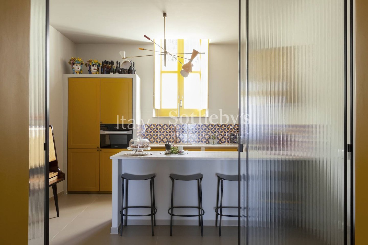 From the portico, ideal for dining or relaxing while enjoying the splendid view of the village rooftops and the azure sky and sea, you can access the garden. Citrus plants and fragrant flowers frame the 12-meter-long and 6-meter-wide infinity pool and the surrounding area, equipped with a bar and pergola for al fresco dining.