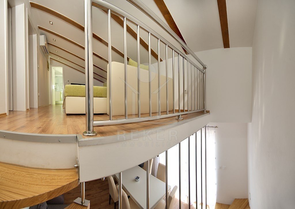 Die zweite, als Maisonette-Wohnung gebaut, hat eine Größe von 95 m² mit drei Schlafzimmern und zwei Bädern. Das Apartment im Obergeschoss ist 34 m² groß.