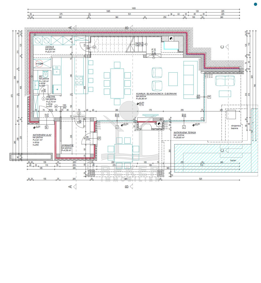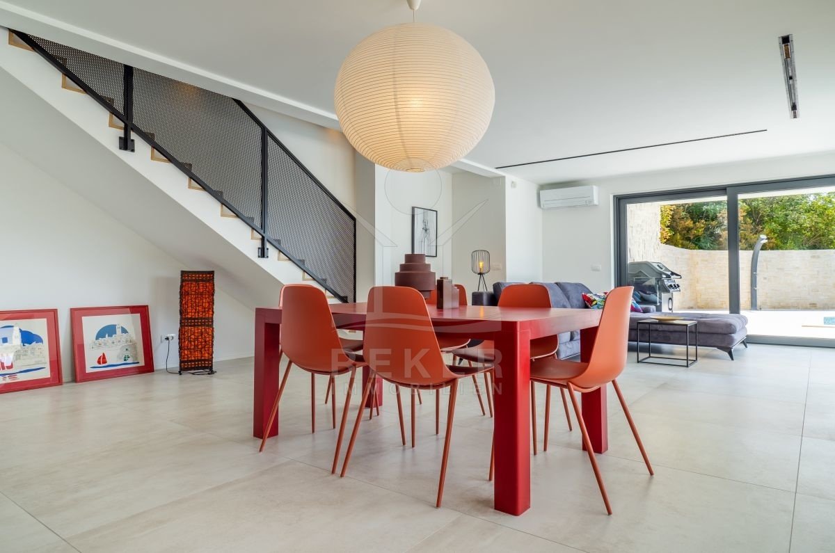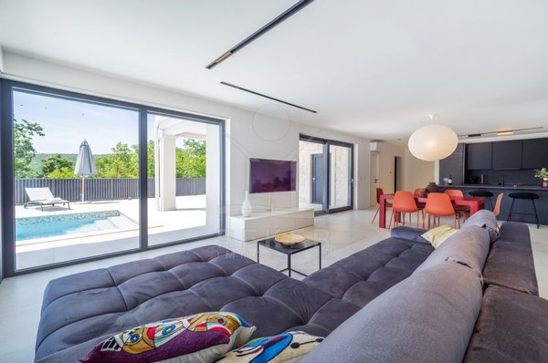 Das Wohn- und Esszimmer mit offener Einbauküche ist der Mittelpunkt der Immobilie. Von hier aus gelangen Sie auf die große, teil überdachte Terrasse mit dem herrlichen Pool.