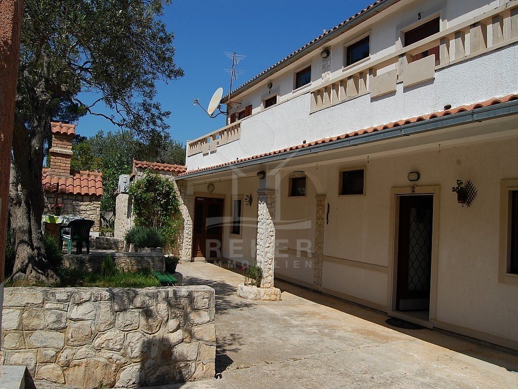 Vier helle Apartments mit einem Schlafzimmer und eigener Terrasse verteilen sich auf den zwei Etagen des Hauses. Das gesamte Großstück lädt zum Entspannen und Wohlfühlen ein. Nutzen Sie das anwesend als eigenes Domizil und bieten sie zudem einen Rückzugort für Touristen. Auf dem Gelände verfügen Sie zudem über zwei weitere Gebäude, ein Lager und ein Haus mit Küche und angrenzendem Raum.