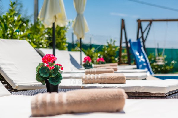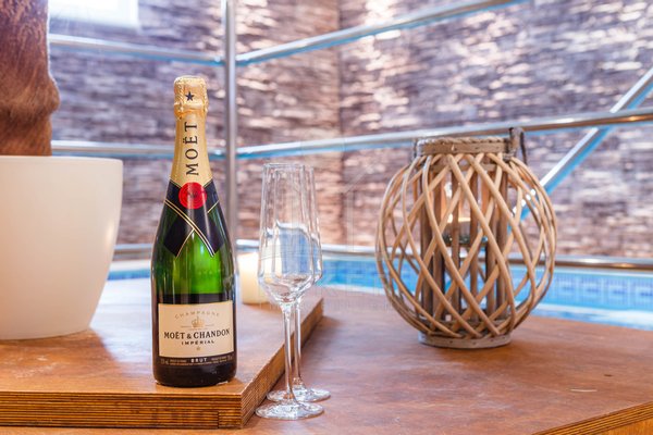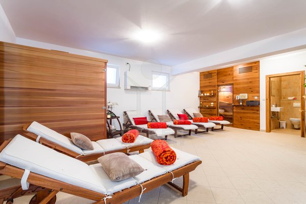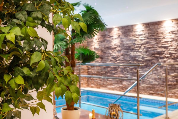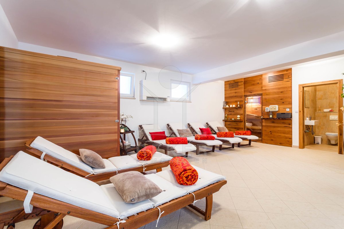 Außenpool mit Sonnendeck und Innenpool - beide incl. Gegenstromanlage und Massagebänken, der Innenpool ist beheizbar,