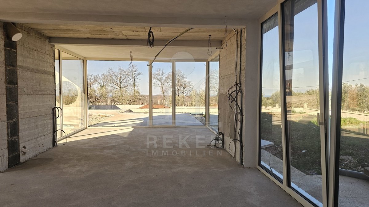Rund 13 Kilometer von Poreč entfernt liegt diese moderne Villa in Vižinada … einer ruhigen Ecke Istriens, wo kaum Nachbarn stören. Die Umgebung ist angenehm still, die Aussicht spektakulär: Sie blicken unverbaubar aufs Meer und weit ins grüne Hinterland. Die westliche Ausrichtung sorgt dafür, dass Sie jeden Abend das Lichtspiel der untergehenden Sonne genießen können. Hier finden Sie genau die Mischung, die viele suchen und nur wenige finden: Privatsphäre mit Blick.