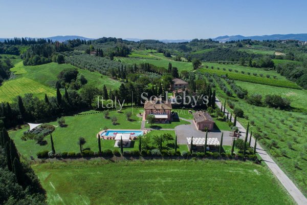 Eine herrliche Villa, eingebettet zwischen den malerischen Hügeln der Toskana in der Provinz Pisa, eingetaucht in eine bezaubernde Landschaft, geschmückt von üppigen Olivenhainen, ausgedehnten Weinbergen, goldenen Weizenfeldern und lebendigen Sonnenblumenwiesen, alles unter dem Dach von Wäldern, die reich an heimischer Tierwelt sind.