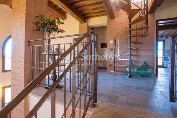 Eine herrliche Villa, eingebettet zwischen den malerischen Hügeln der Toskana in der Provinz Pisa, eingetaucht in eine bezaubernde Landschaft, geschmückt von üppigen Olivenhainen, ausgedehnten Weinbergen, goldenen Weizenfeldern und lebendigen Sonnenblumenwiesen, alles unter dem Dach von Wäldern, die reich an heimischer Tierwelt sind.