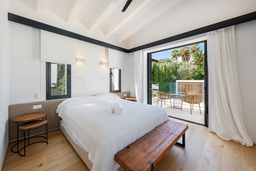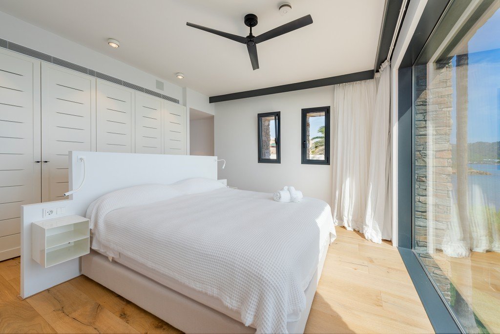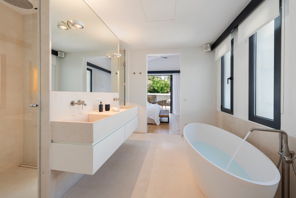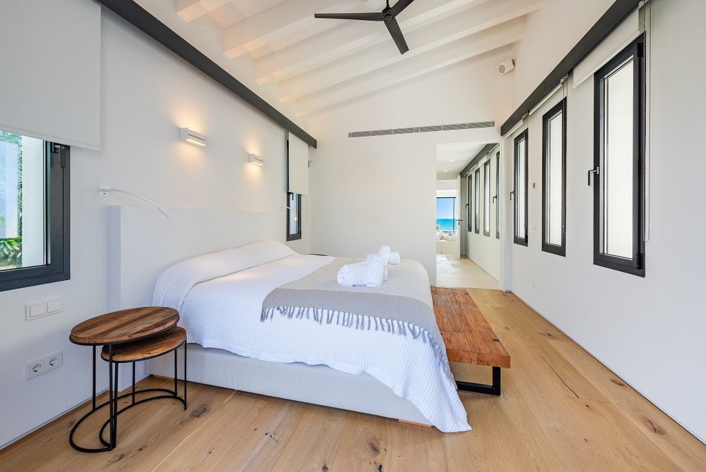 Ein halbes Stockwerk höher befindet sich ein weiteres Doppelschlafzimmer mit eigenem Bad und einem begehbaren Kleiderschrank. Die gesamte obere Etage ist der Master-Suite gewidmet, die über ein Badezimmer, eine private Terrasse und einen fantastischen Dachbereich zum Entspannen verfügt, ideal, um den Anblick und das Meeresrauschen zu genießen.