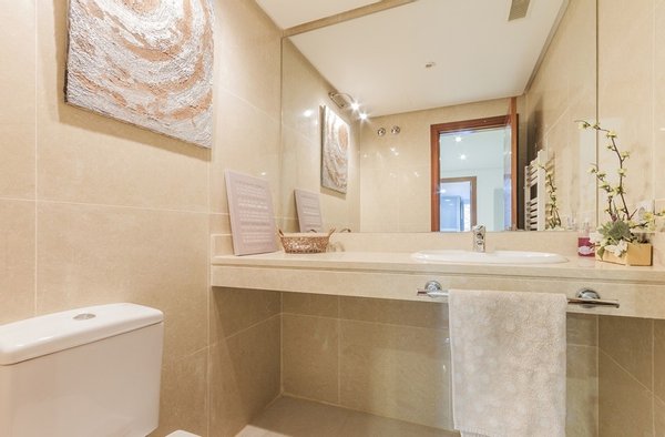 Im Inneren verfügt die Wohnung über drei Doppelschlafzimmer, zwei Badezimmer und ein Gäste-WC. Die Badezimmer wurden leicht renoviert. Es gibt eine voll ausgestattete Küche mit angrenzendem Hauswirtschaftsraum sowie ein großzügiges Wohn-Esszimmer mit Zugang zur Terrasse.