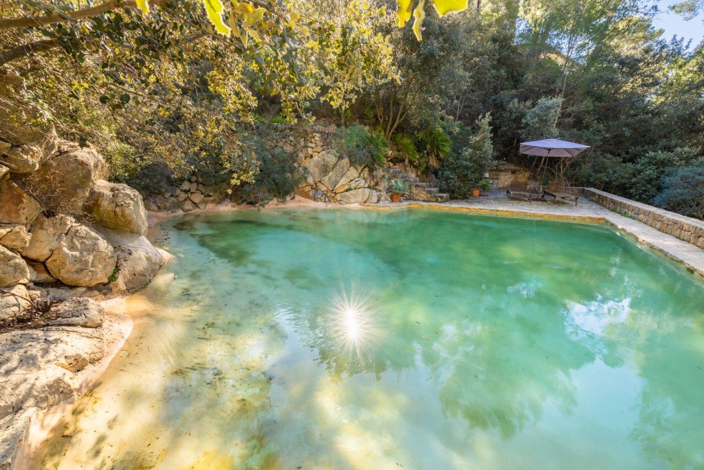 Im Außenbereich befindet sich ein wunderschöner Swimmingpool, der sich harmonisch in die natürliche Umgebung einfügt und über einen kleinen Weg vom Haus aus erreicht werden kann. Außerdem gibt es ein Kinderspielhaus im Wald, ein perfekter Ort für die Kleinen, um sich in einer sicheren Umgebung auszutoben und Spaß zu haben.
