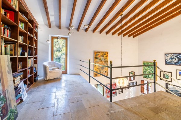 Im Erdgeschoss befindet sich ein gemütliches Wohnzimmer mit direktem Zugang zu einer großen, überdachten Terrasse, auf der man im Freien speisen und die schöne Aussicht auf die Täler genießen kann. Die Küche verfügt über originelle Elemente wie einen traditionellen Brotbackofen, und von hier aus haben Sie Zugang zu einem Bürobereich und dem Gästebad.